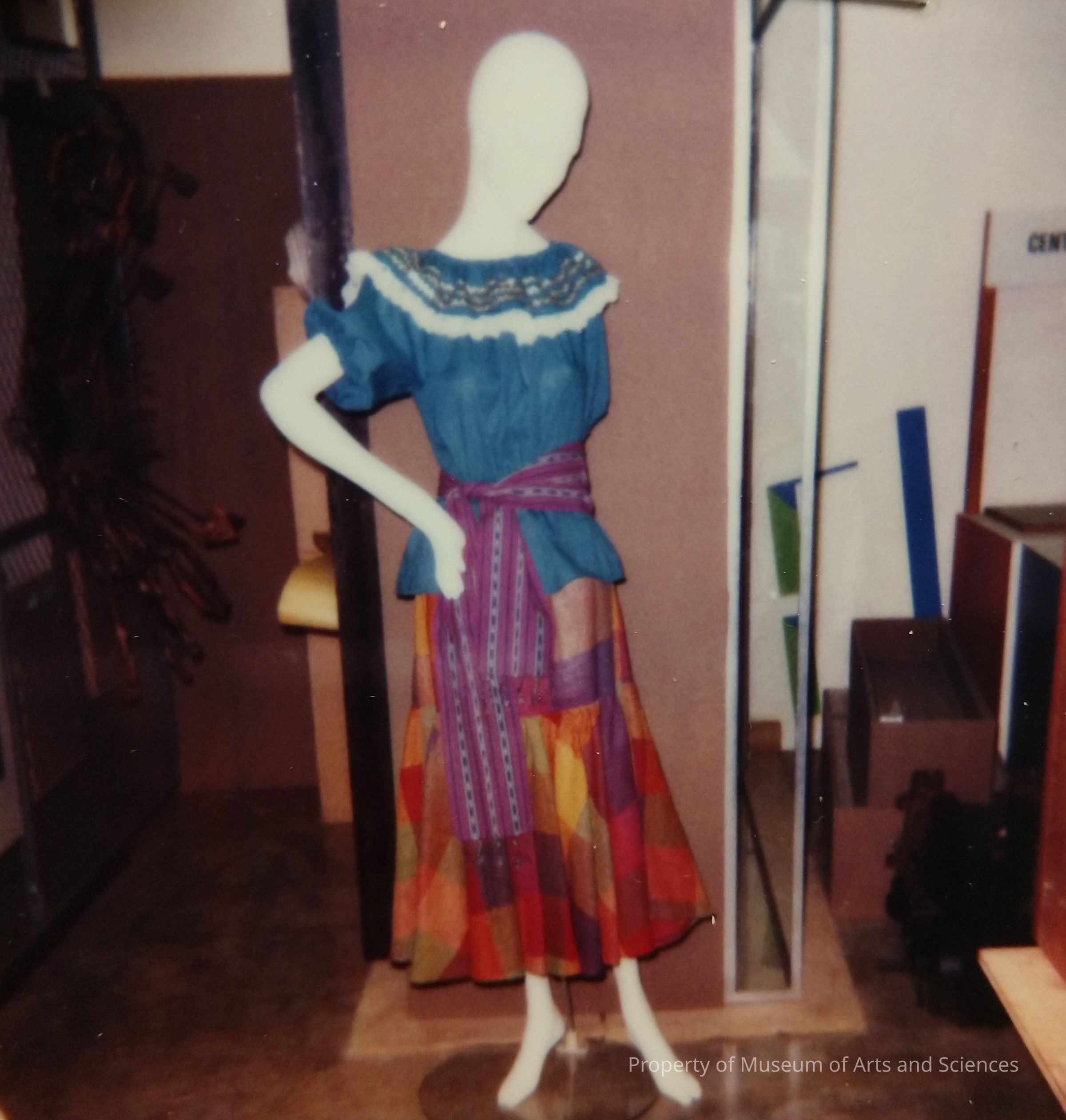 Skirt is ankle length, slightly gathered with a deep ruffle. Fabric is a coarse weave plaid with purple, yellow, orange, magenta, and olive green. Blouse is peacock blue with puffed sleeves and a rounded neckline. Three is a ruffle around the neckline that is trimmed with braid and has lace edging. Long fringed belt in coarse weave fabric of magenta, white, and blue.Collection