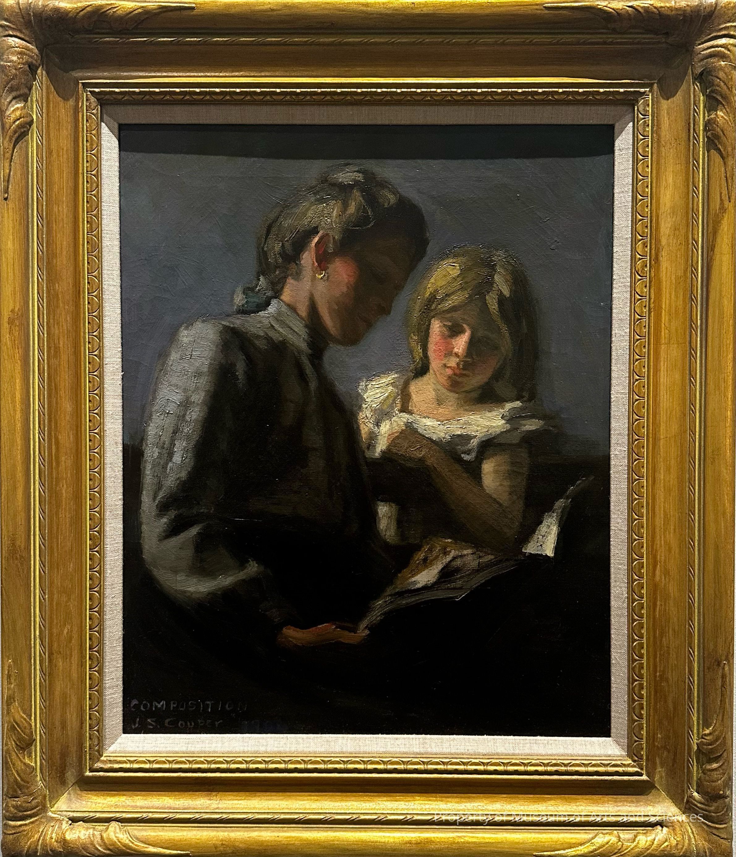 Mother and child with mother in 3/4 view on the left and blond child on the night. Muted, somber oil colors with touches of golden light. The mother is reading.Collection