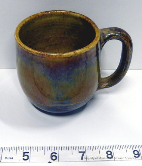 Functional stoneware mug with Mountain Gold glaze; brown/black color; stamped on bottom. Rich colorful glaze swirls over surface of mug.Collection