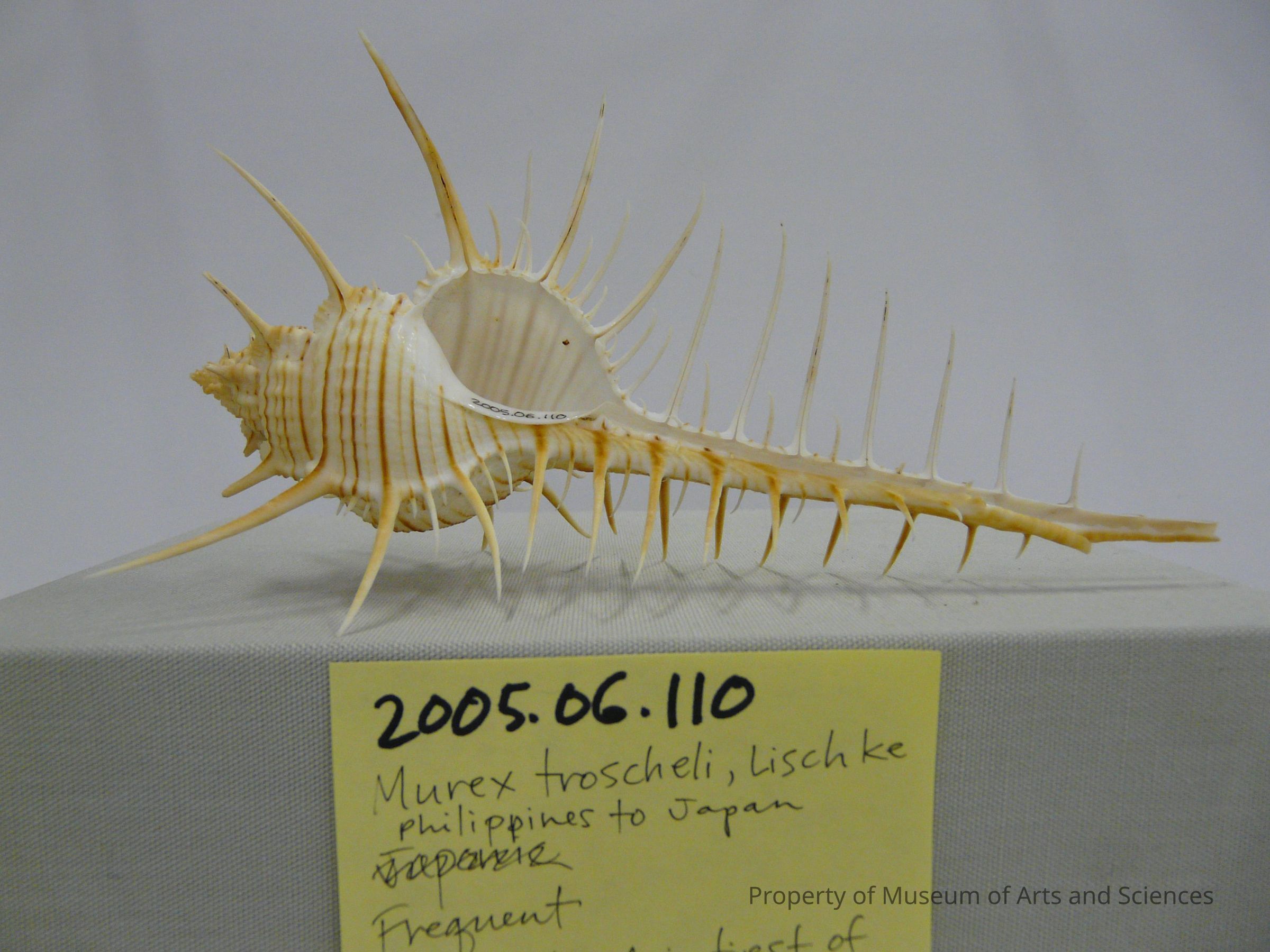 Frequent. One of the daintiest of all Murices and much admired, but not always easy to procure with all spines perfect. The thin spiral bands of brown extend onto the spines.Collection