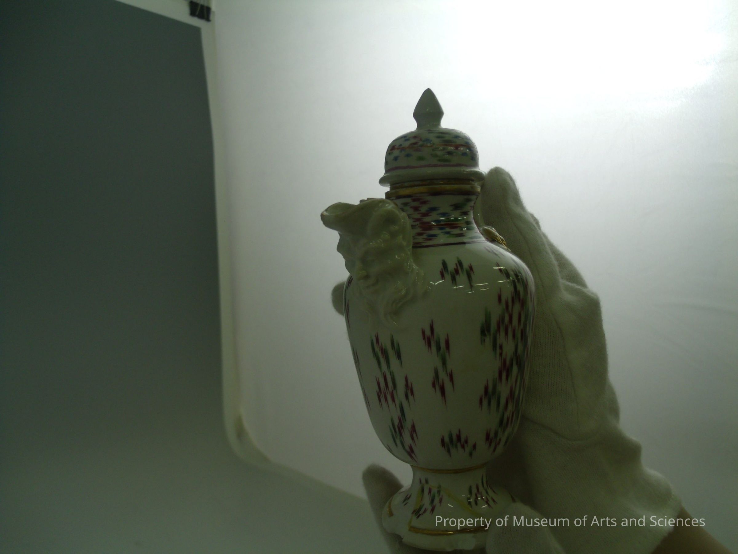 A handpainted Nymphenburg porselain covered creamer with green chintz pattern, mask spoutCollection