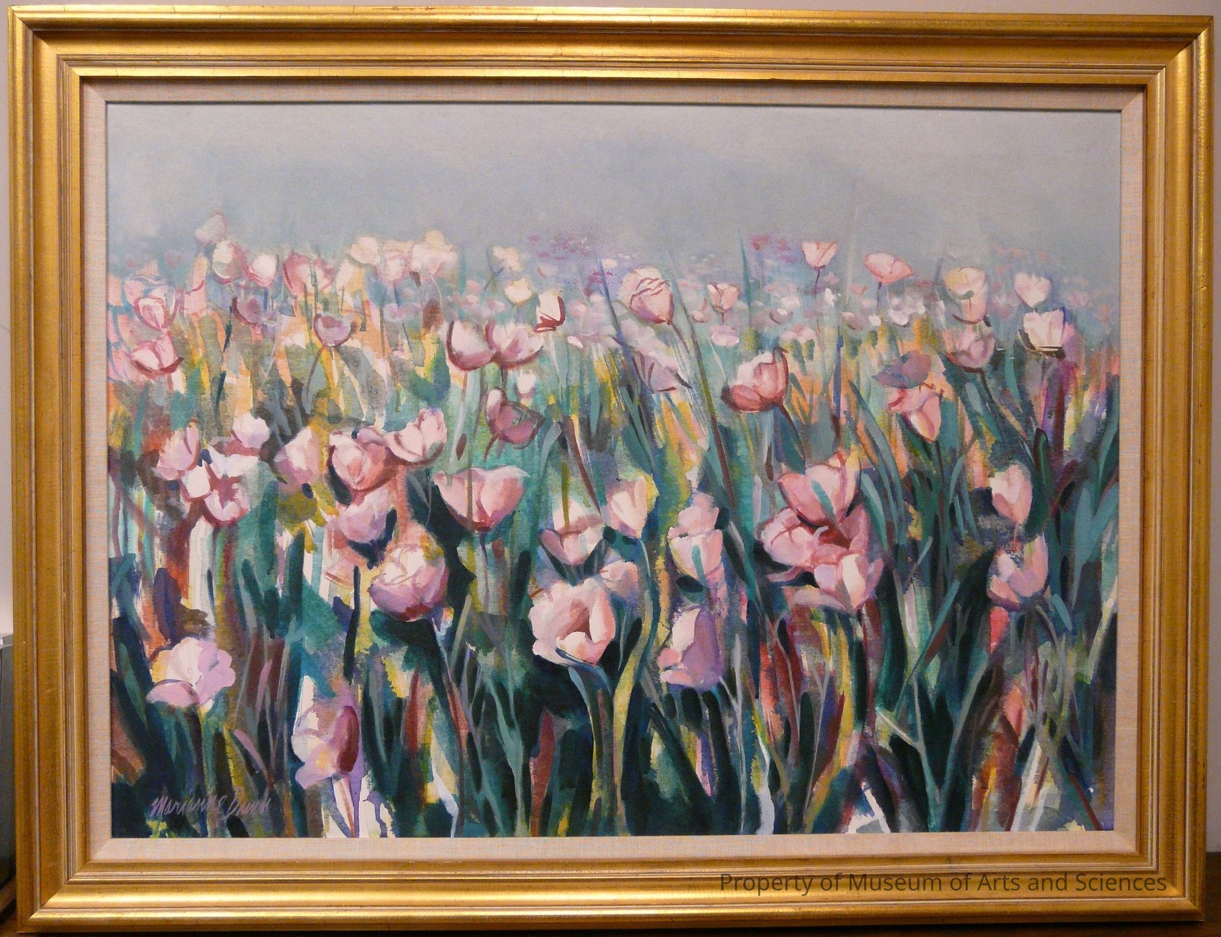 A field of poppies in pink and mauves fills three-fourths of the canvas from bottom to topCollection