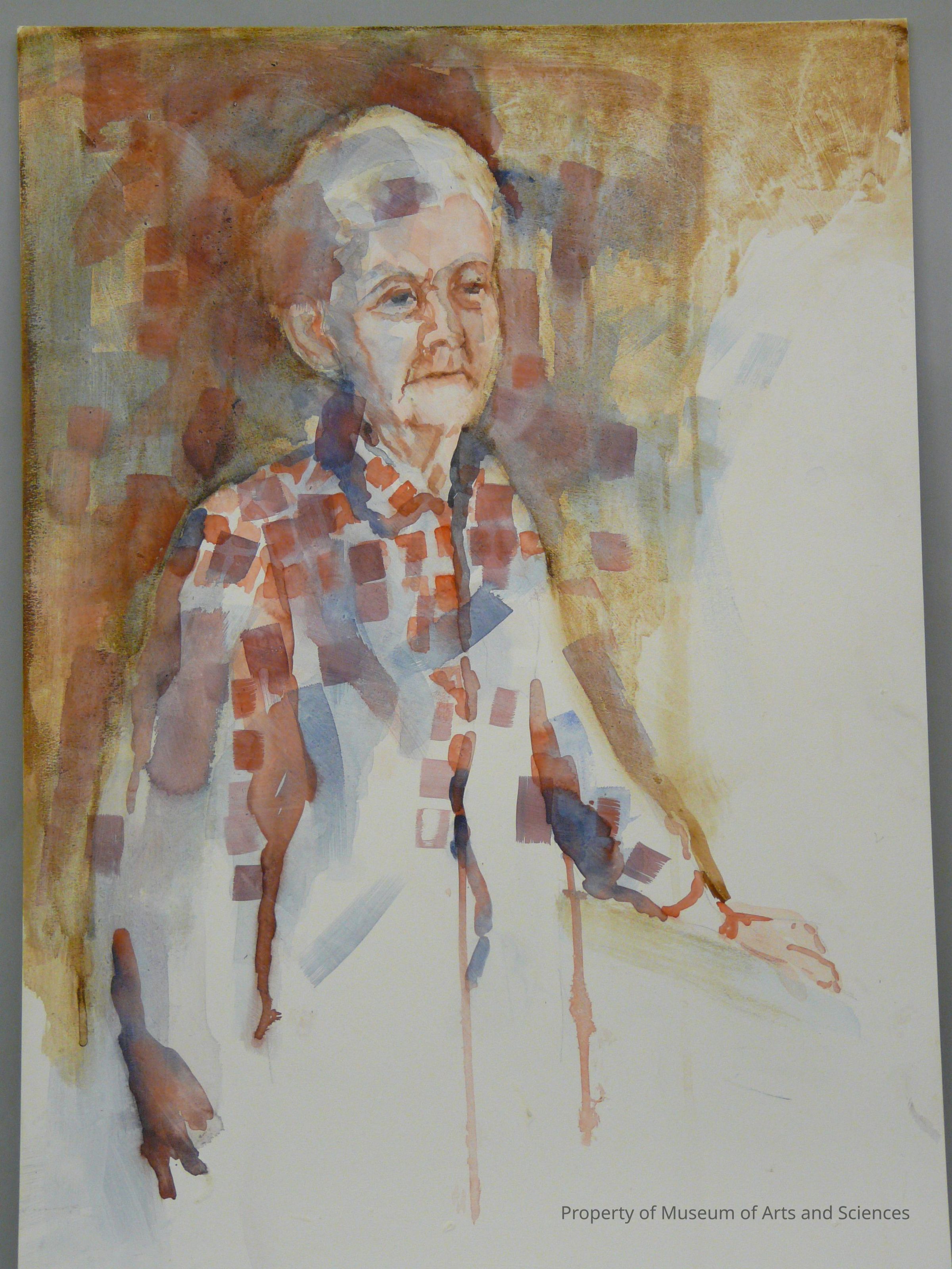 watercolor sketch of older woman; mostly browns with brush strokes of reds and red/blues - very sketchy and unfinished on right and bottomArtwork Details