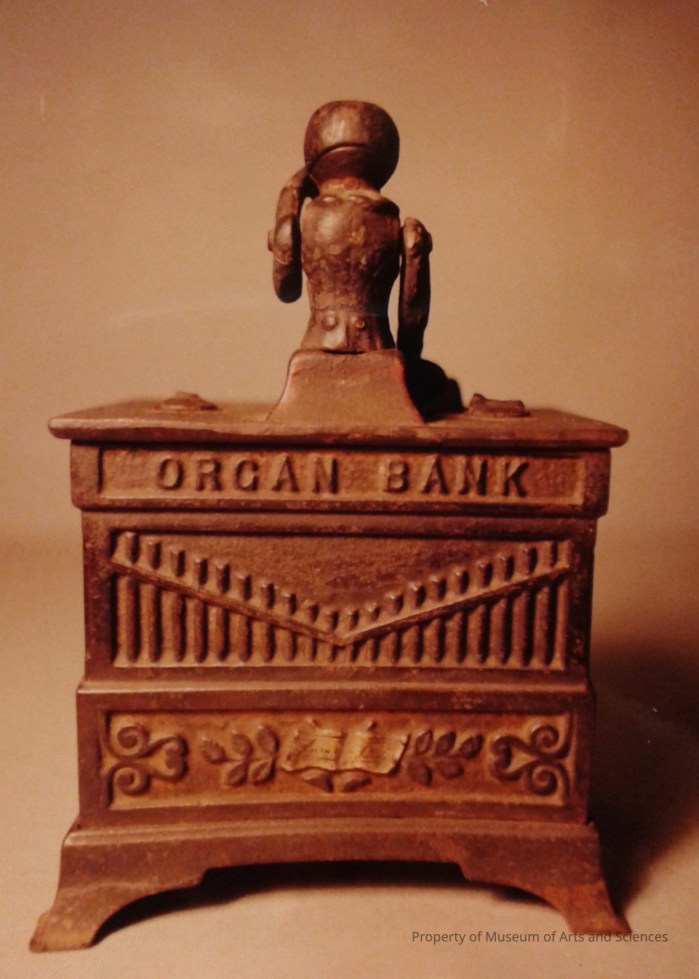 Fitted with chime of beels? and dancing figures, which revolve when the handle is turned. The monkey recieves the contributions, deposits them in the vault and pelitley raises his hat.