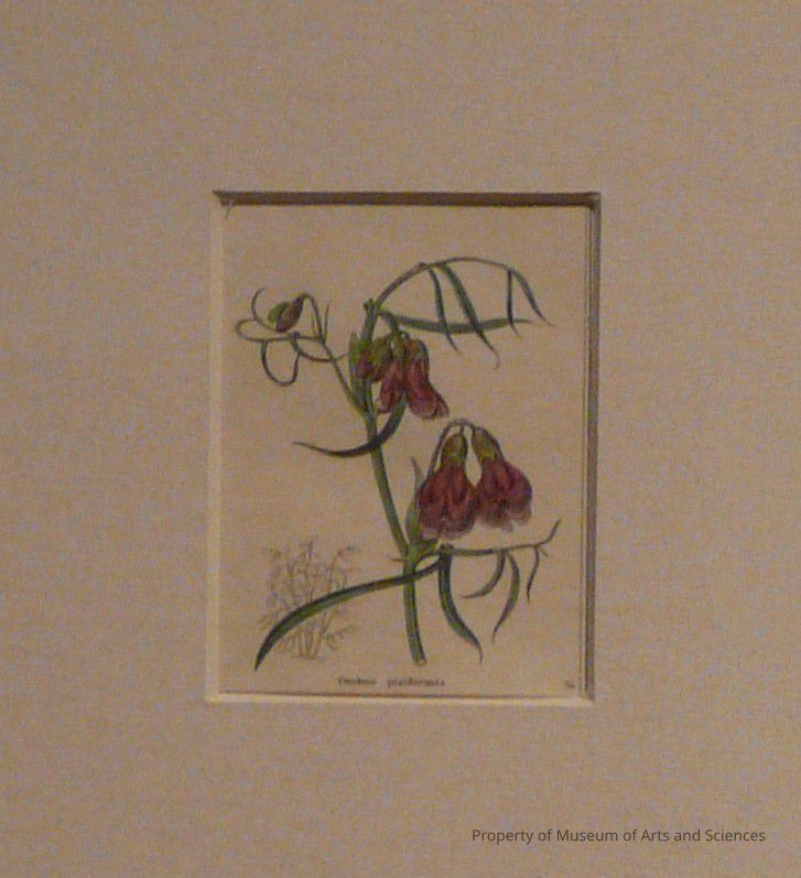 There is a central drawing of the dark purple blossoms on a green stem with some leaves. To the lower left is a line drawing of the plant. This is cut from a page with four similarly sized drawings.Collection