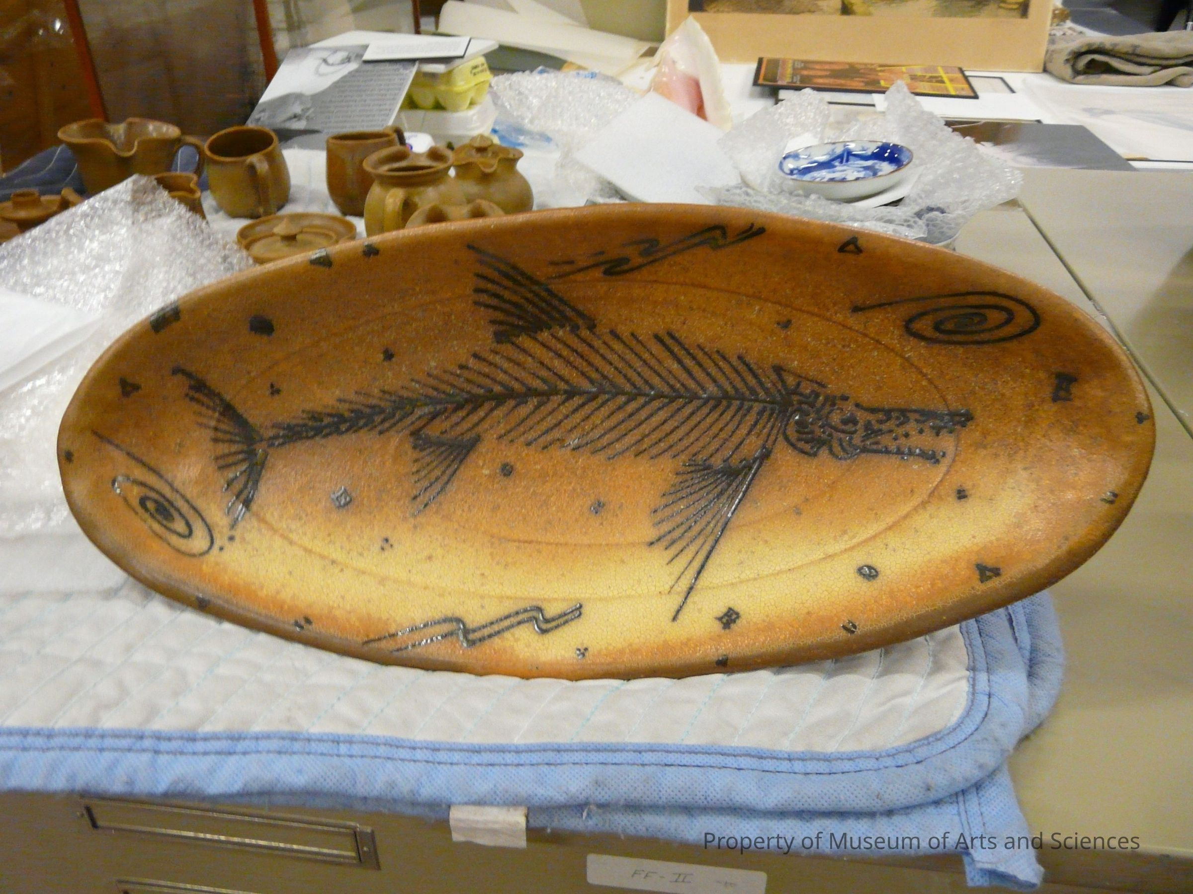 Oval clay platter is decorated with a drawing of a fish skeleton and spirals and dotsCollection