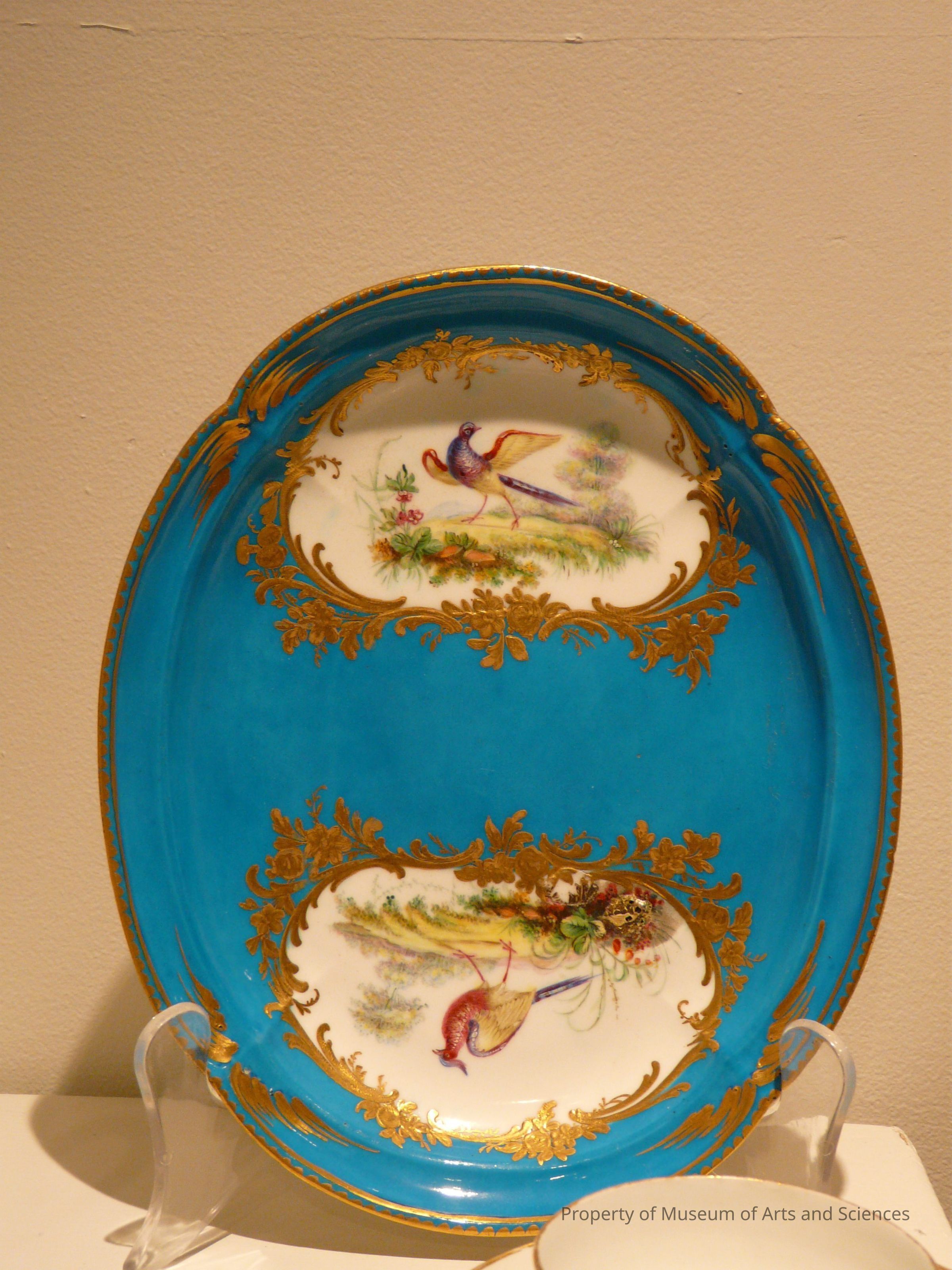 A Sevres porcelain oval plate, turquoise bleu celeste glaze with hand painted exotic birds, gilt medallionsof floral scrolls, glit trim.Collection