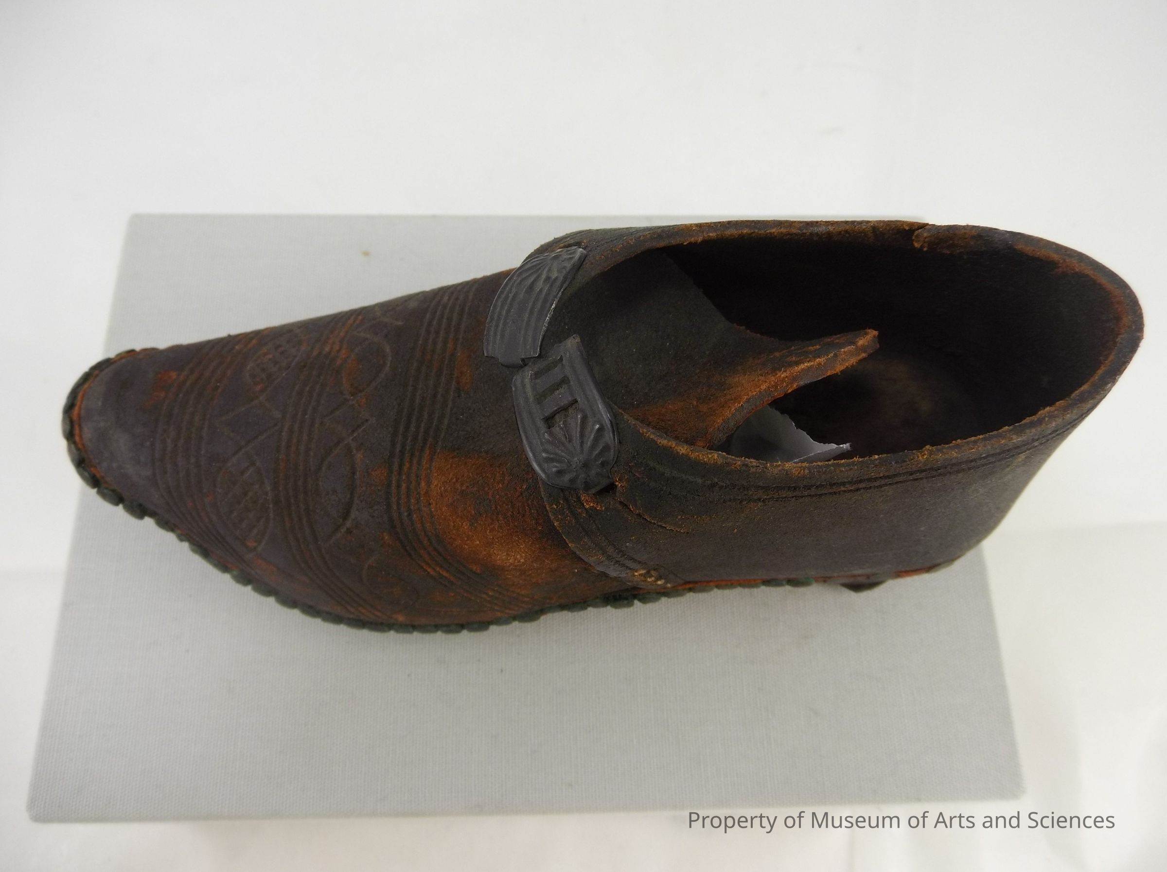 very small, hard leather with tooled design, wooden shoes 2 different pairs: one buckled; one tied; children's shoes made during WWII in England- had wooden soles because England could not get leather during the war; 2 pair given (see newspaper article)Collection