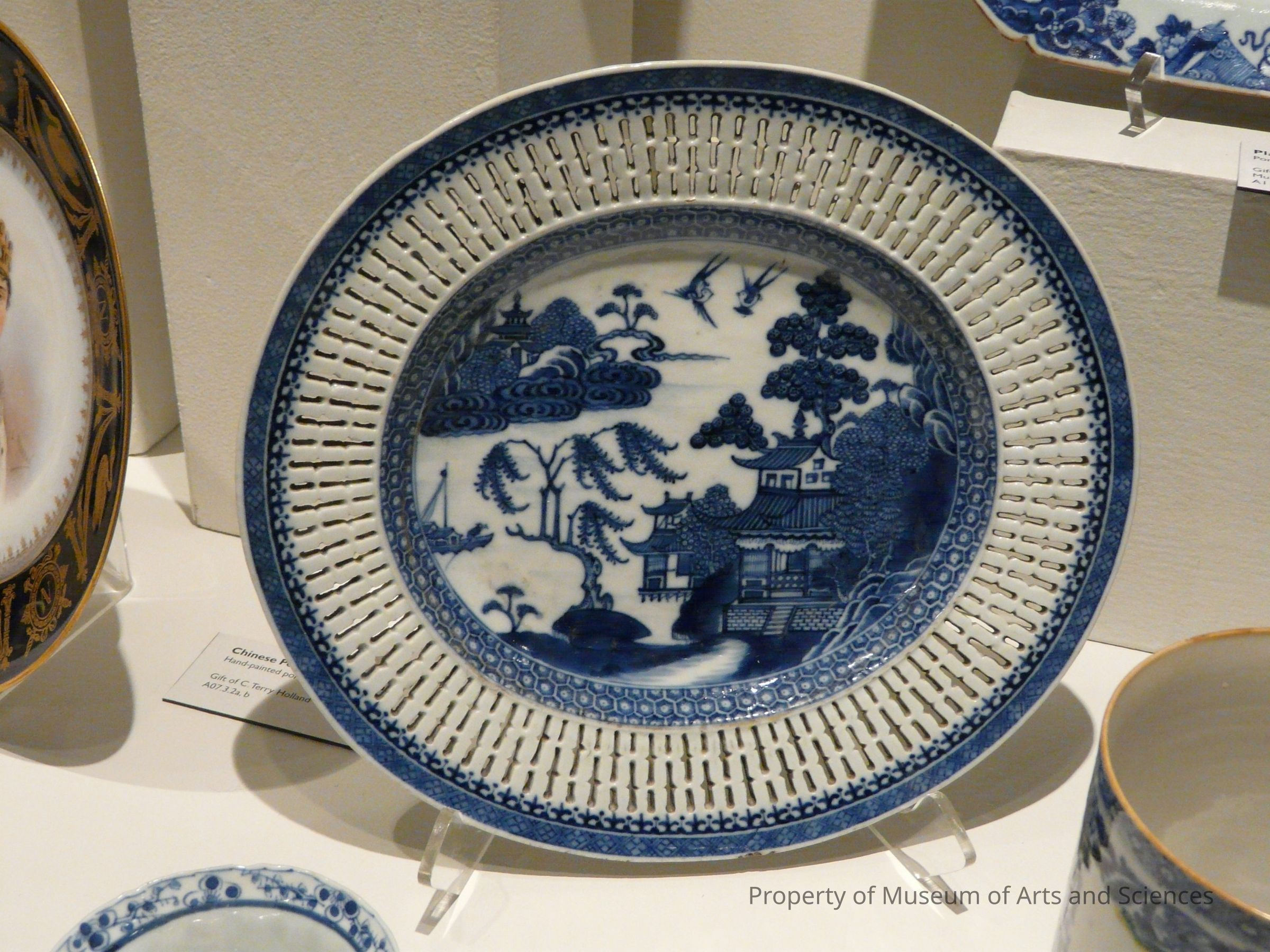 Blue and white porcelain Chinese export, c 1770 oval platters with open-work design in the rims and Oriental landscapes in glaze designCollection