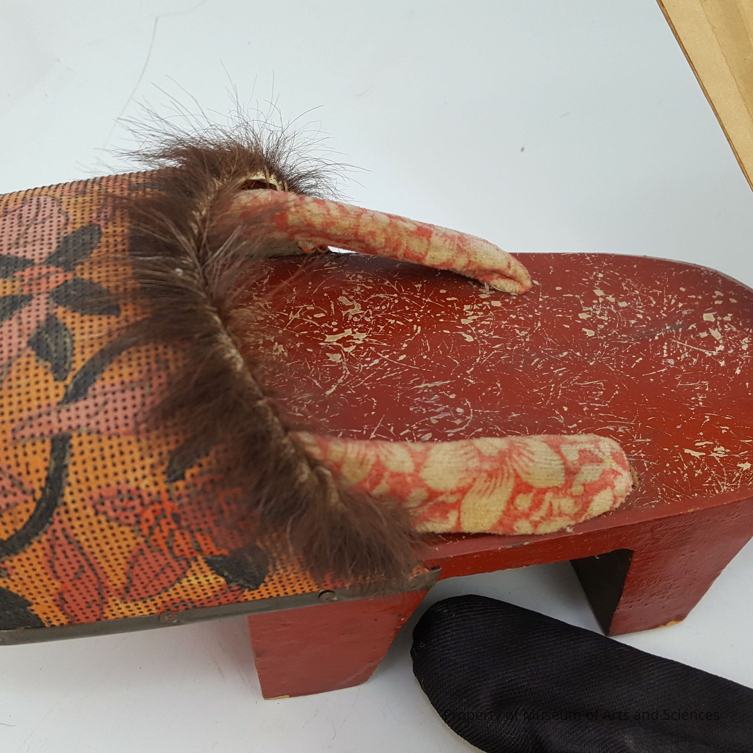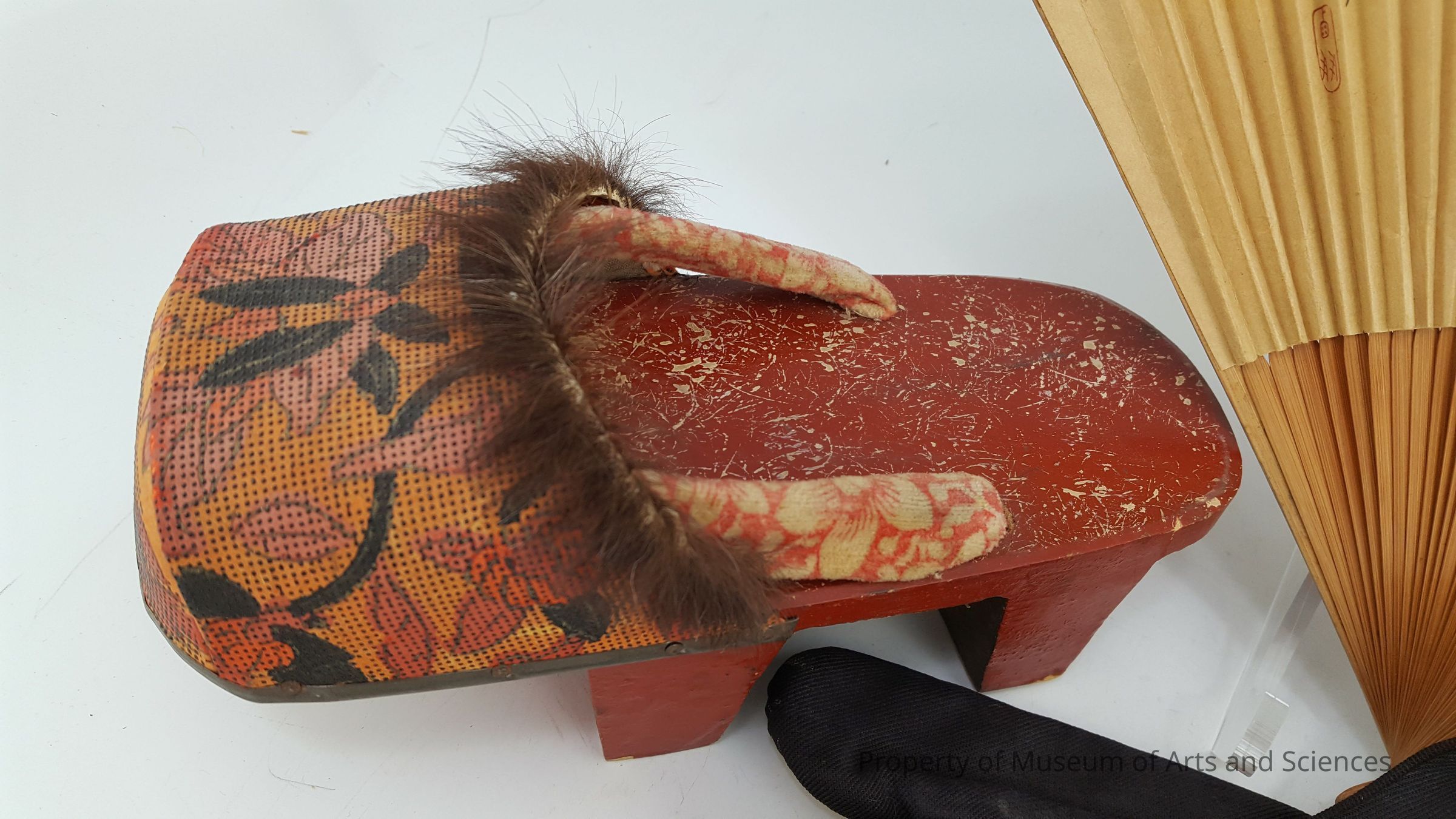 Rust colored wood with cloth brocode and black fur 2" double stilts, yellow arabesques showing through red lasqer inside. Geta (??) are a form of traditional Japanese footwear that resembles both clogs and flip-flops. They are a kind of sandal with an el