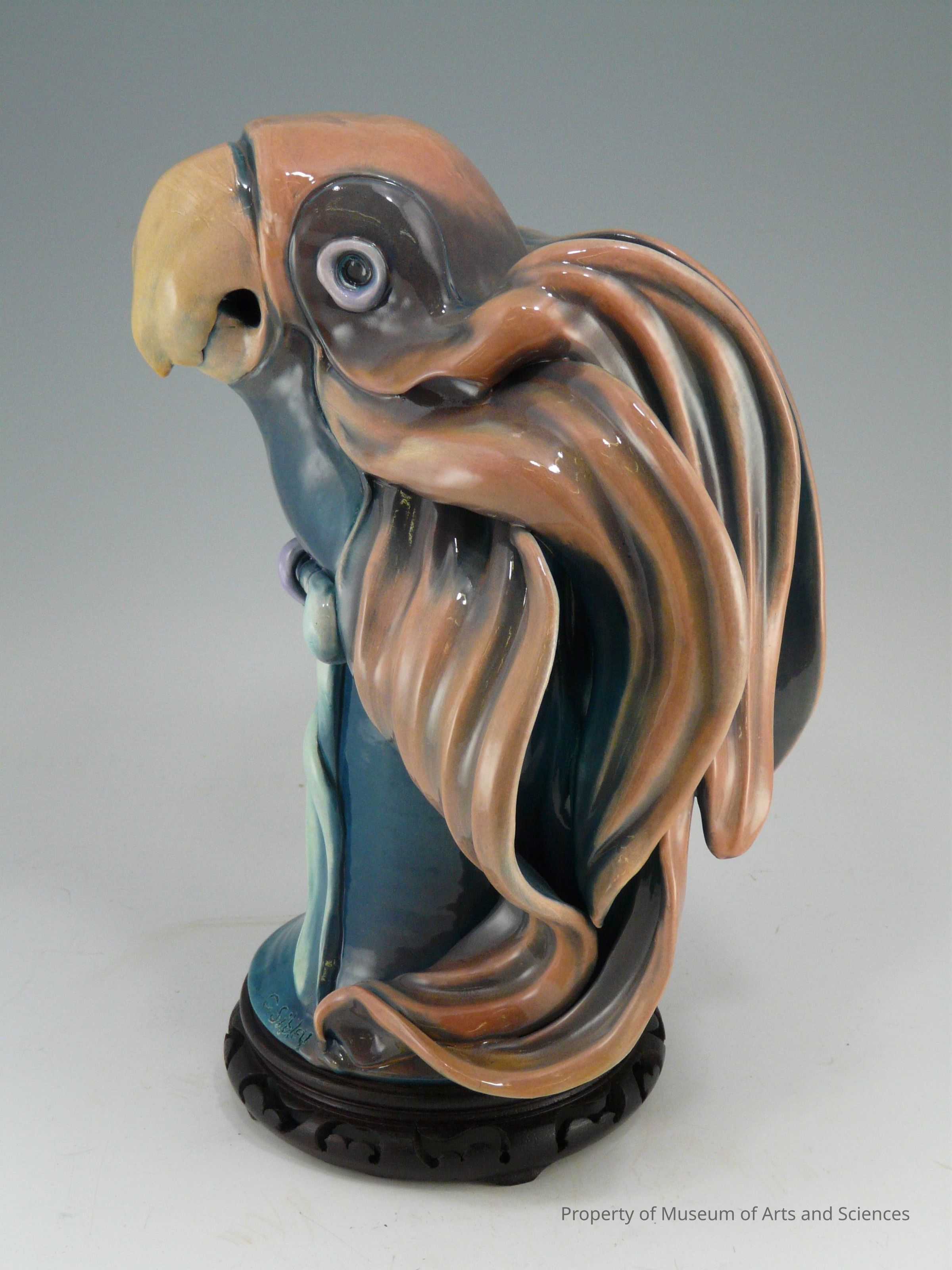 White clay body with underglaze coloration and colored glazes blue green, orange coloration, C. Sibley (side bottom). Wooden stands for each marked A90.16.1a,b respectively.Collection