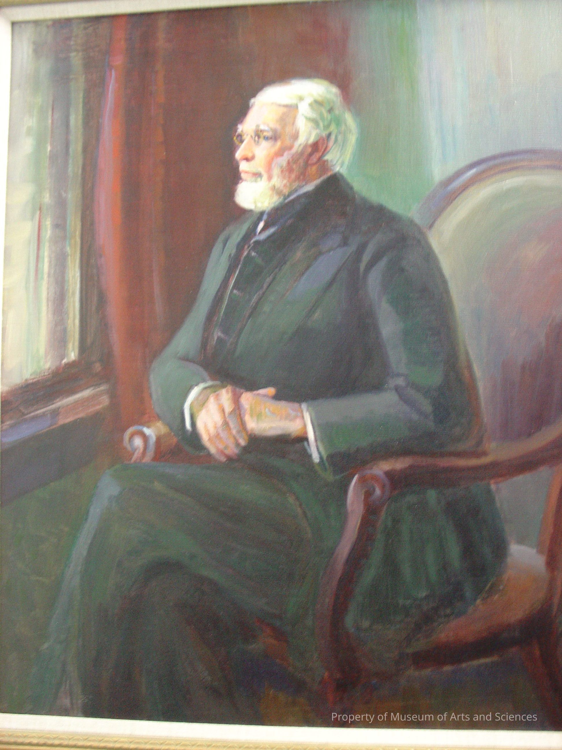 Finished portrait of a man seated in a chain and clasping his hands in his lap-spectacles and a beard, characterizedCollection