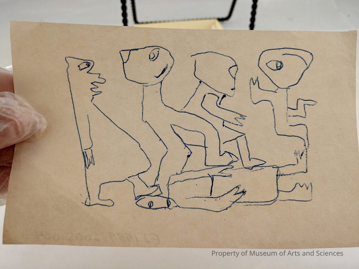 Pen drawing showing four figures walking from left to right over a fallen figure.Collection