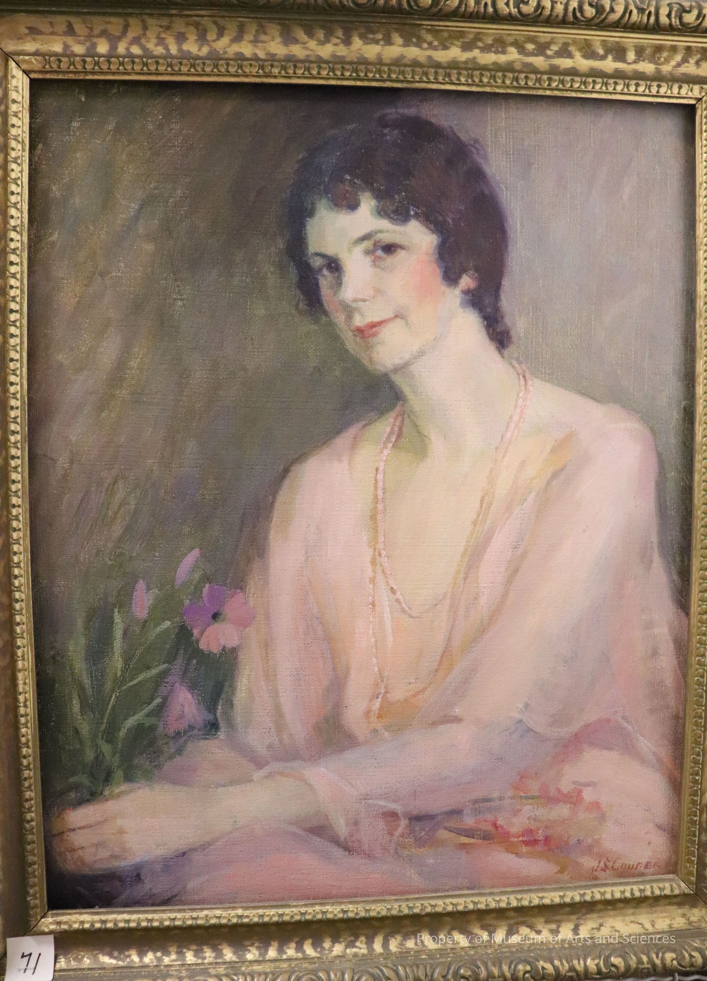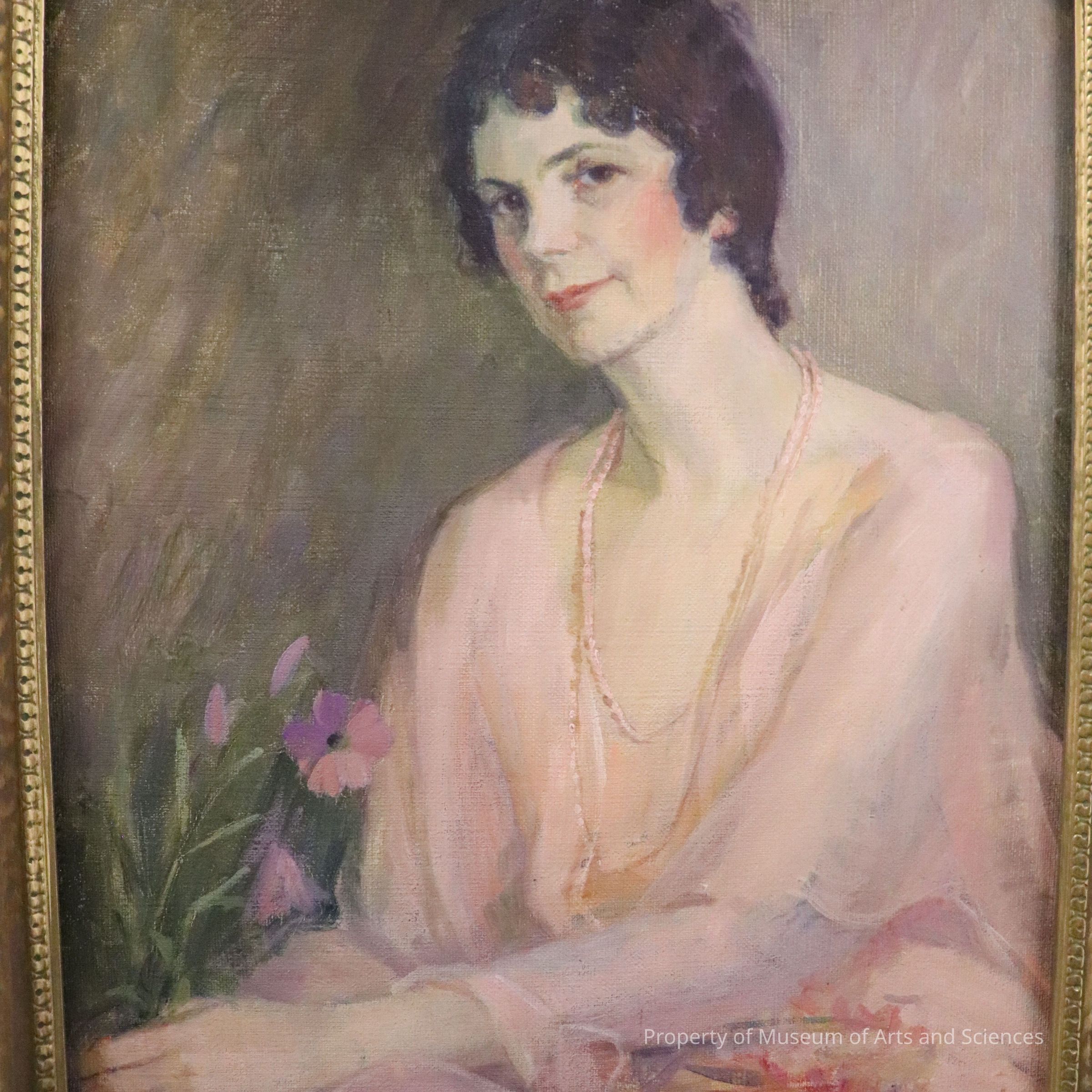 Portrait of woman facing left. Brunette. Pearl necklace. Holding flower in lapCollection