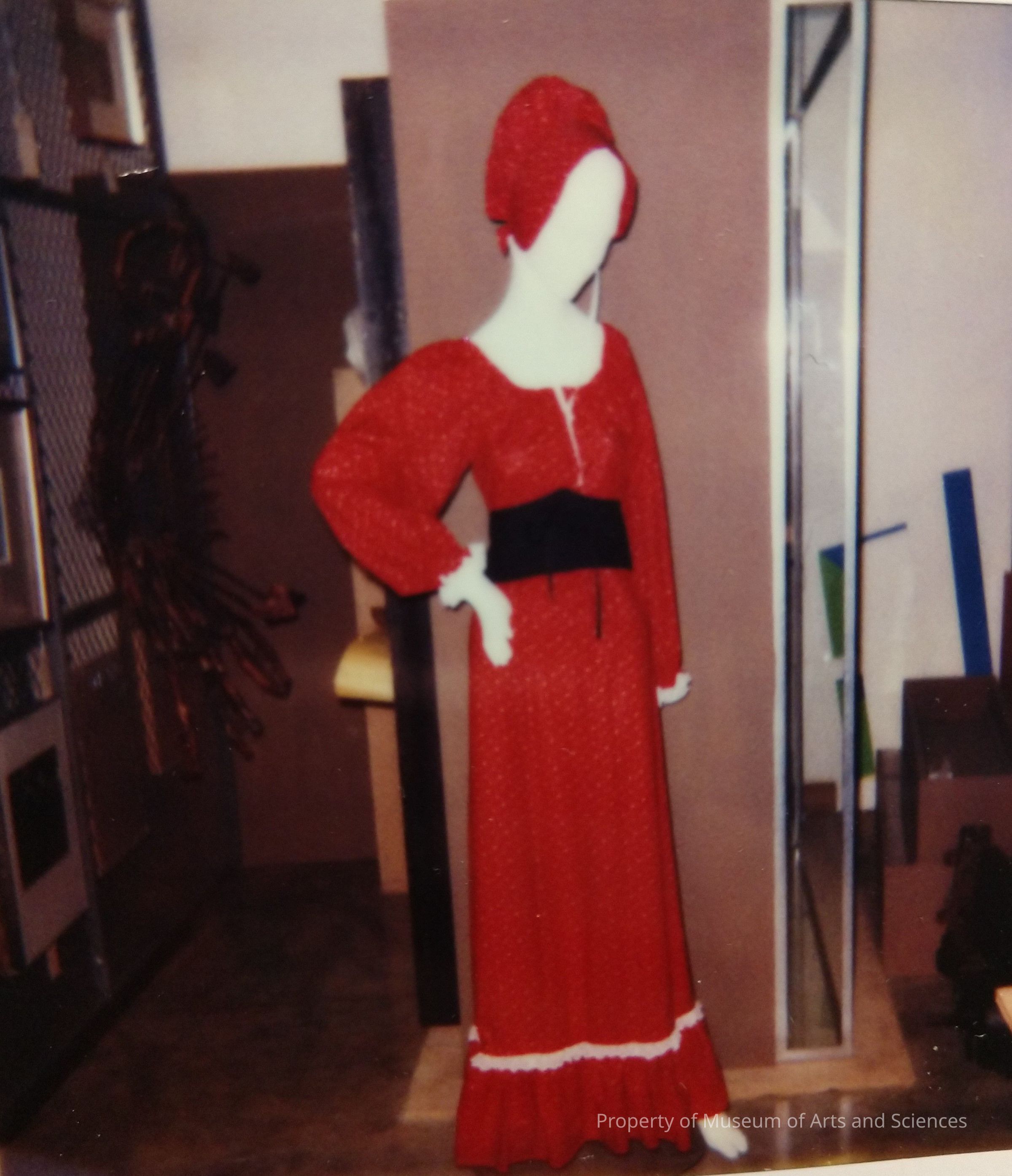 Long dress made of red calico fabric and has a wide ruffle and lace edging around the bottom. Dress has a rounded neckline and long full sleeves with elastic and lace edging at the waist. It is worn with a black lace-up cummerbund. There is a red calico bonnet with white satin ribbon tie. There is a smaller black cummerbund with no lacing.Collection