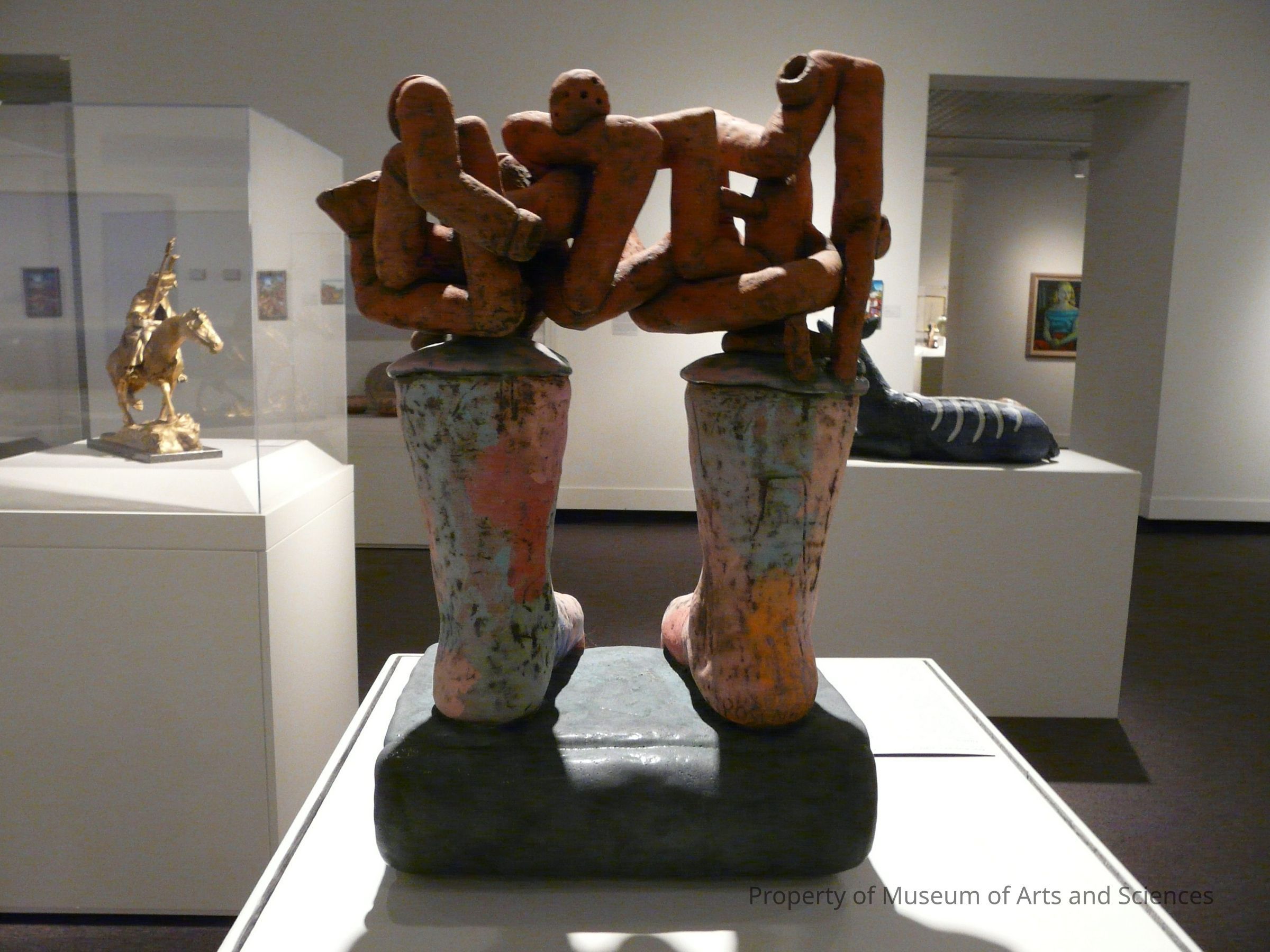 The sculpture is a large blue book with white pages with the spine to the back. The book is surrounded by two human feet, ankles and lower shins; the elongated toes are curled over the top of the book. The feet are a mottled blue and pink.Collection