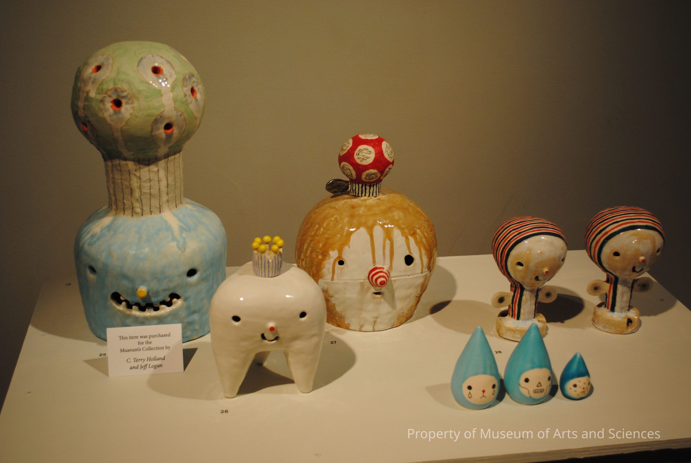 Sculpture with light blue cylider shaped head or base that includes a face with a green spherical shape covered with holes sitting on a cylider with stripes on top of head.Artwork Details