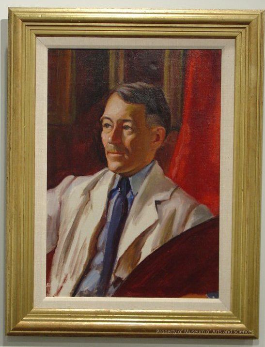 Portrait of a man believed to be Shorter's teacher, Wayman Adams. This is a 3/4 view with the man looking to the left. He wears a white jacked with a blue shirt and tie. He appears to be seated in front of brown and red curtains.Collection