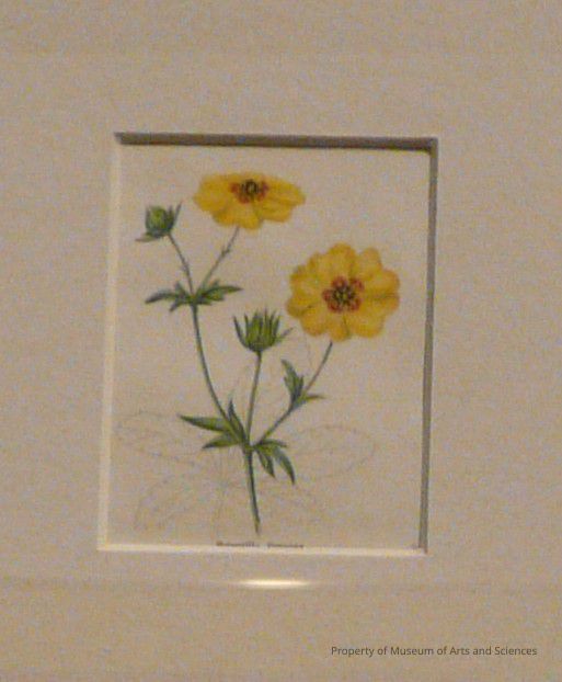There is a central drawing of the yellow blossoms on a green stem with some leaves and buds. Behind is a line drawing of the full leaf. This is cut from a page with four similarly sized drawings.Artwork Details