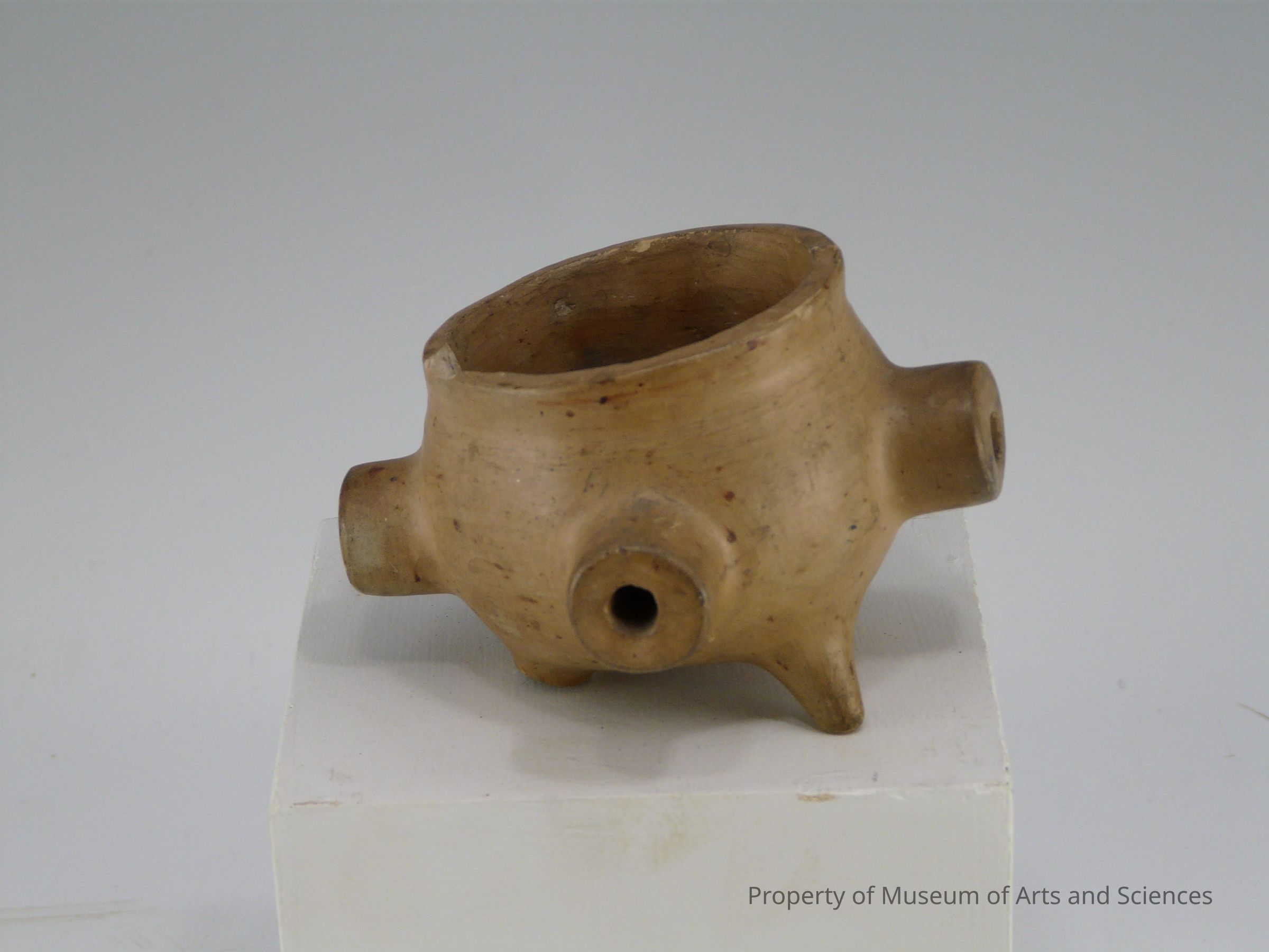 Modern "Indian"? pottery bowl. 3 legs (1 broken), 4 projecting hollow arms giving (?) to bowl, light tan.Collection