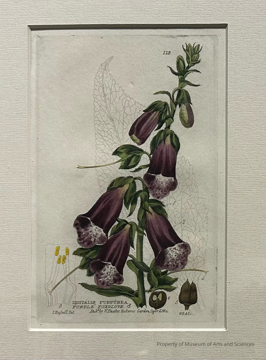 There is a central drawing of the stem with leaves and purple flowers. There is a line drawing at the bottom left and two colored smaller drawings of flower parts at the bottom right.Artwork Details