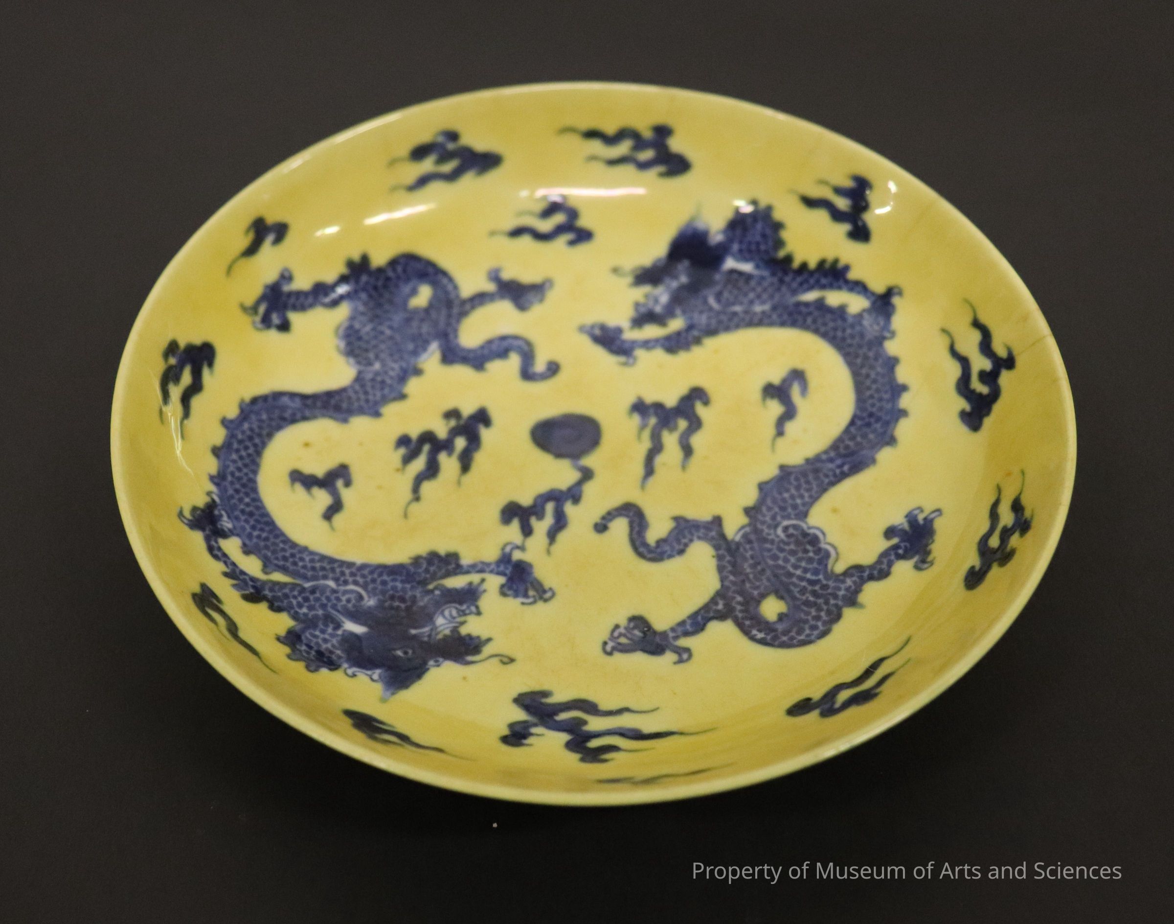 Yellow ground with under-glaze blue confronting dragons four-clawed chasing the illusive pearl of wisdom center.Collection