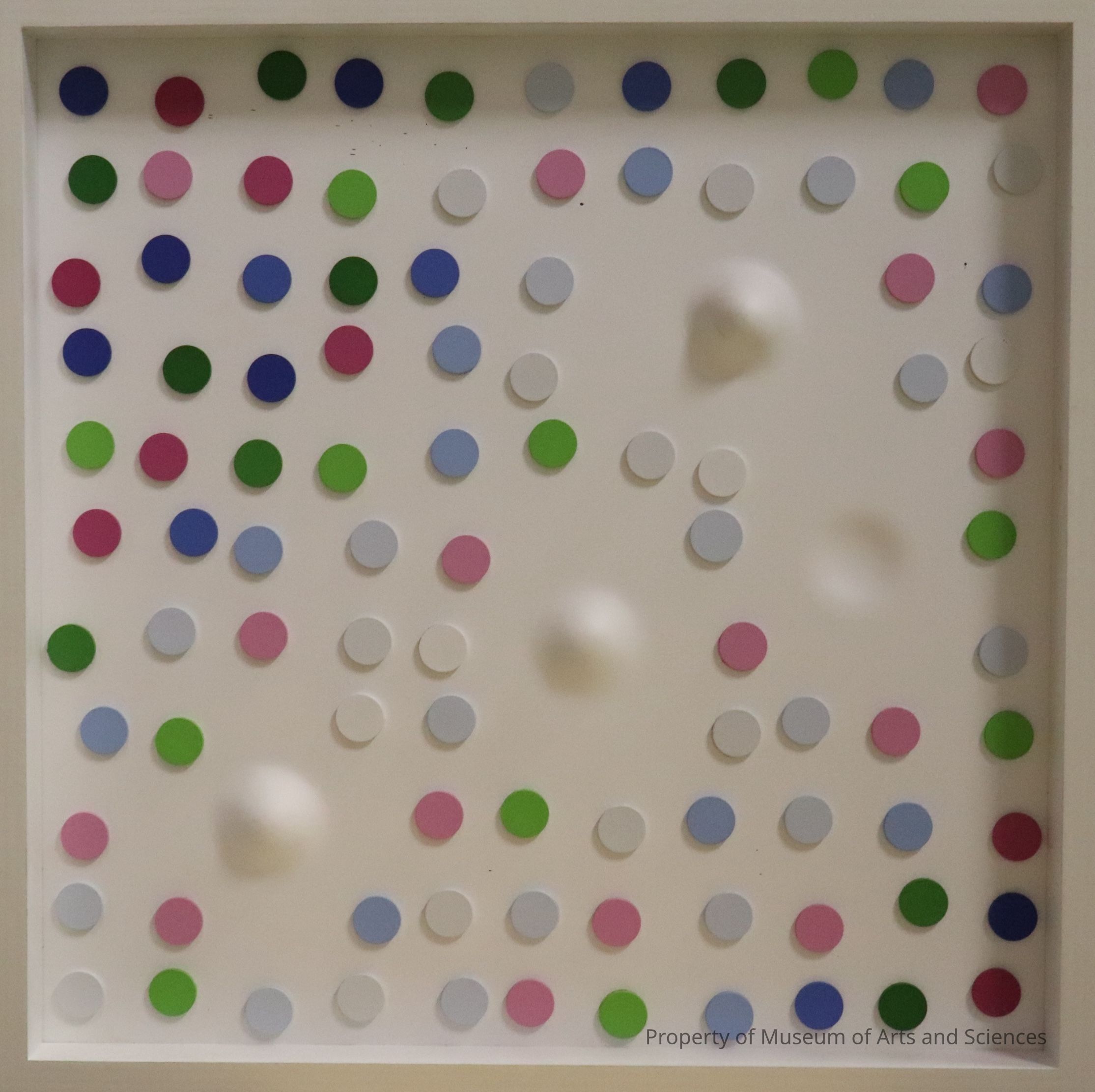 White plastic-like ground with 1 indentation , 3 protrusions and many colorful dots applied. White frame.Artwork Details