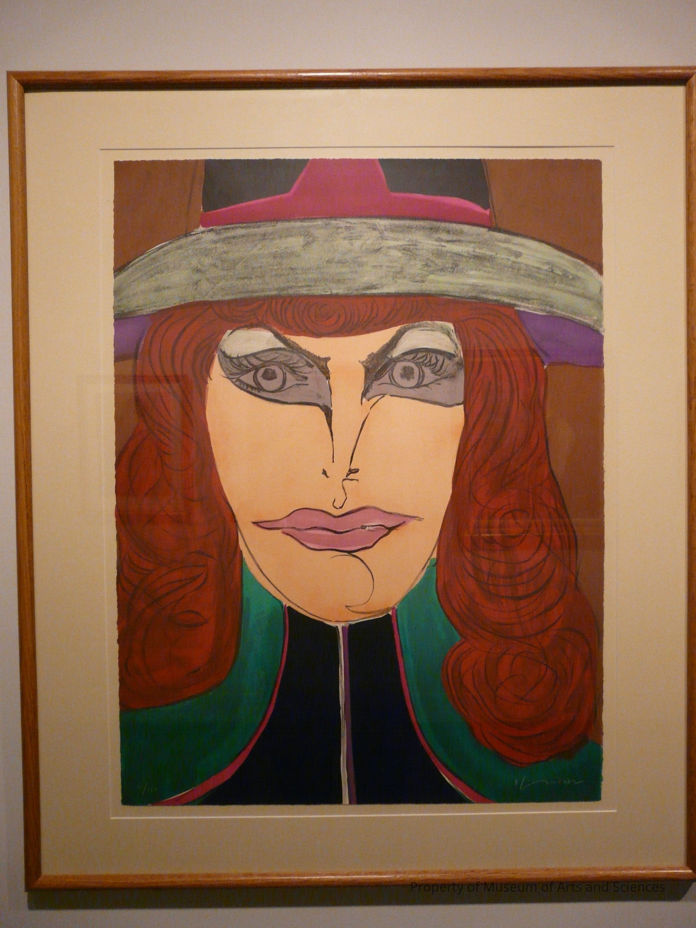Frontal view of woman's head and neck with hat visible at top. Strong, darkened eyes and bold mouth with long red hair and disburbing countenance. Wears green and black high necked sweater with pink pipingArtwork Details