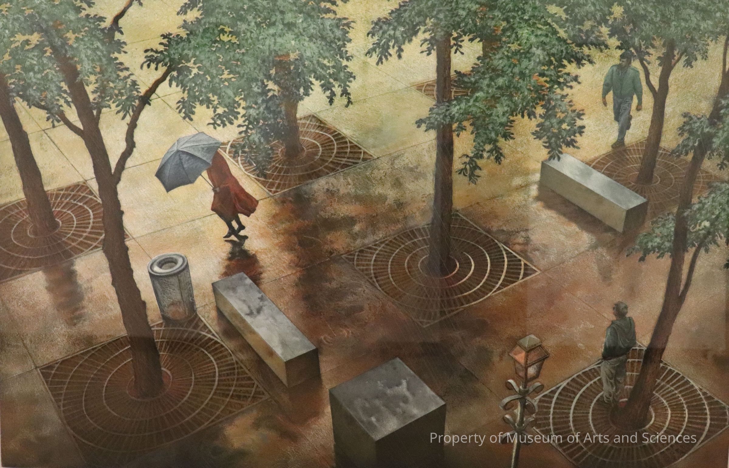 Aerial vantage point of urban park. Concrete sidewalks, trees, 2 male figures and a female with umbrellaArtwork Details