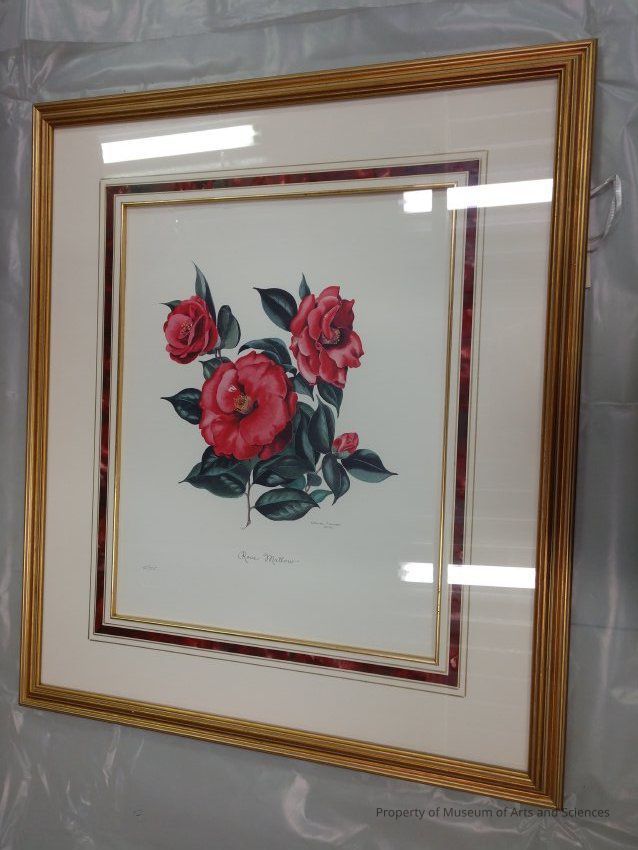 A set of flowers lay in the center of a white background. In the center there is one large redish pink flower accompanied by two slightly smaller flowers and a small bud in the right lower corner of the flower arrangment. There are also several dark green leaves with in the grouping.Collection