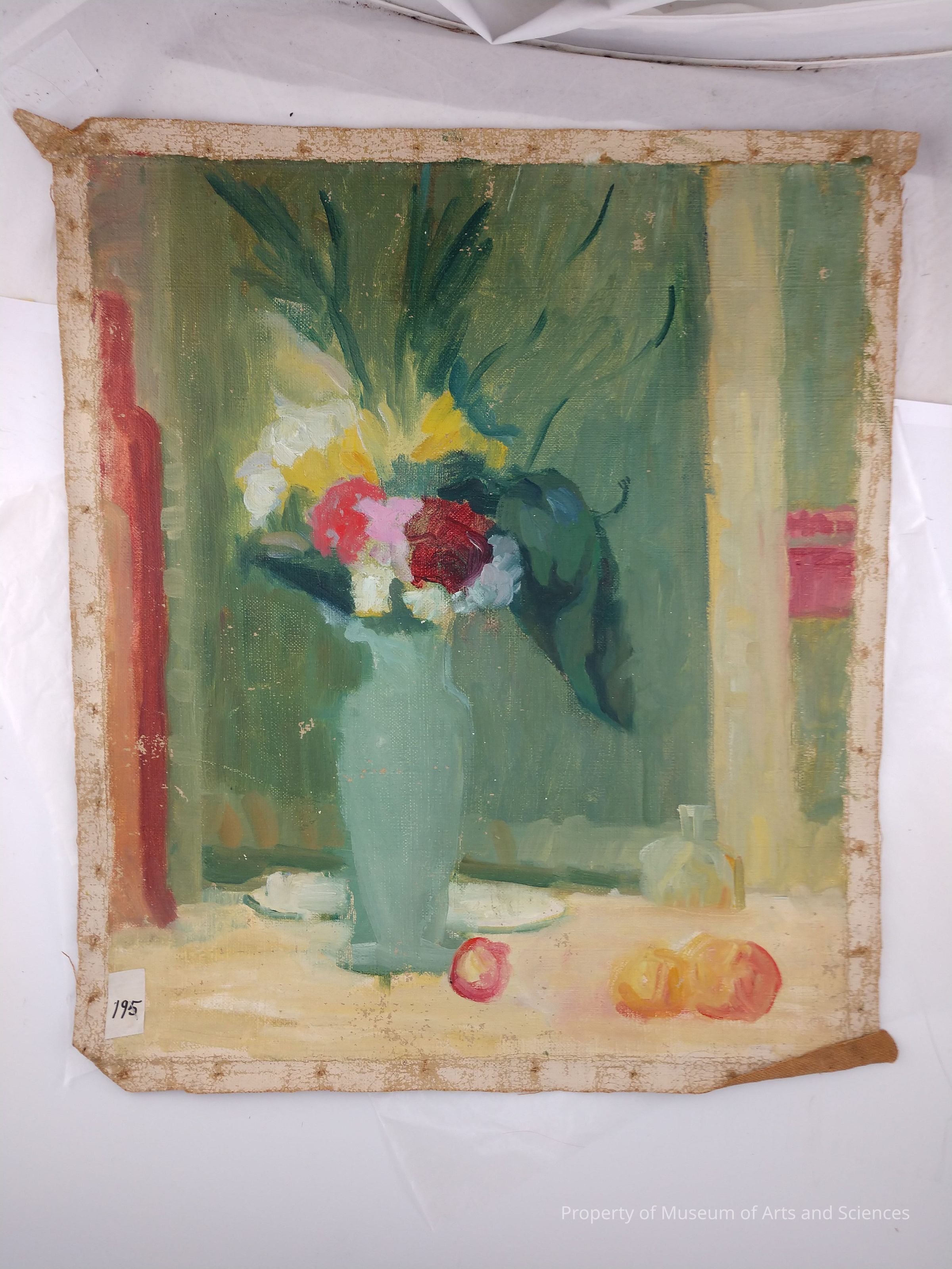 Green Vase holding- yellow, red, and pink flowers- other objects are scattered on the tabletop and background is flat green.Artwork Details
