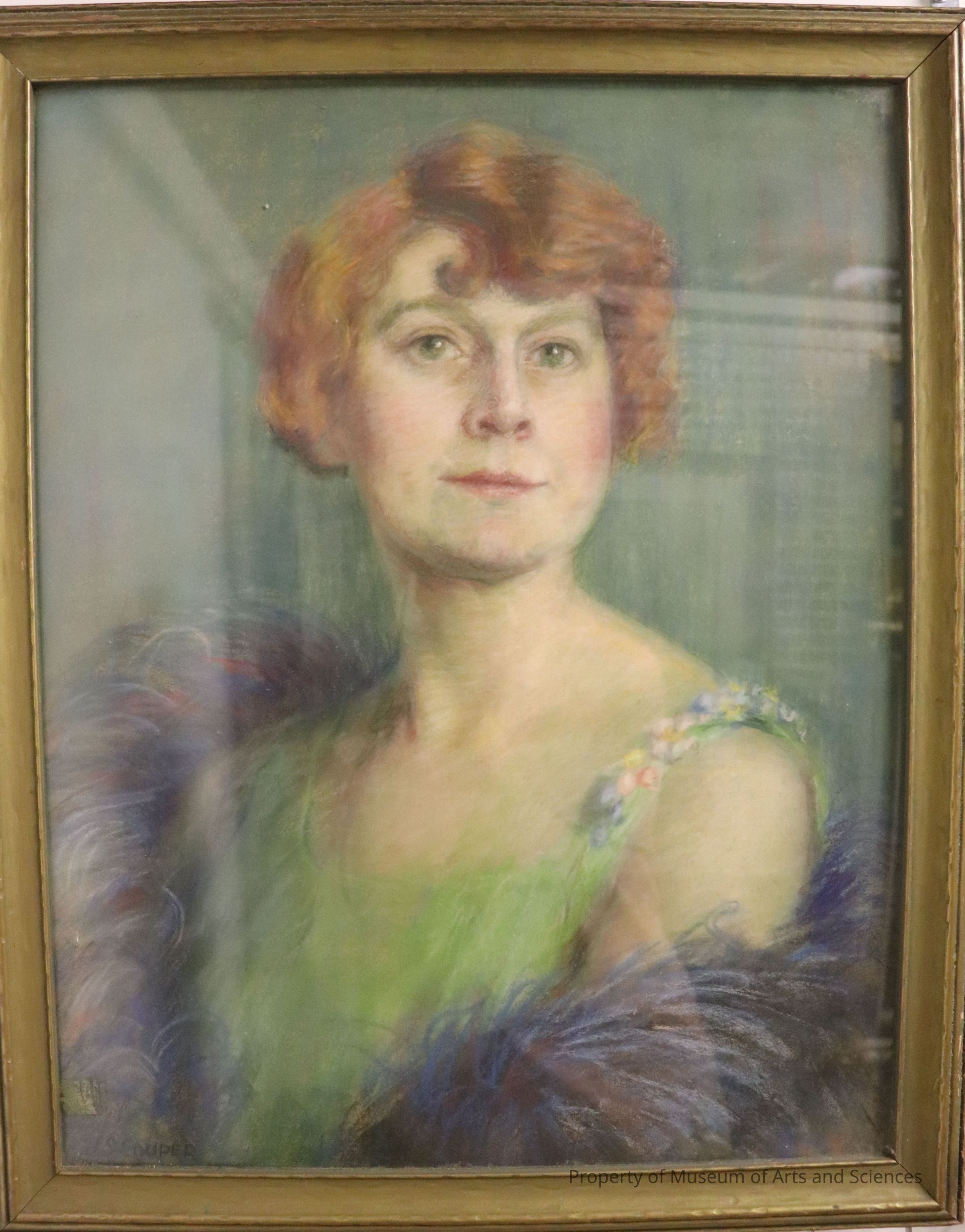 Female portrait. Outward looking. Red hair. Feathered shawlArtwork Details