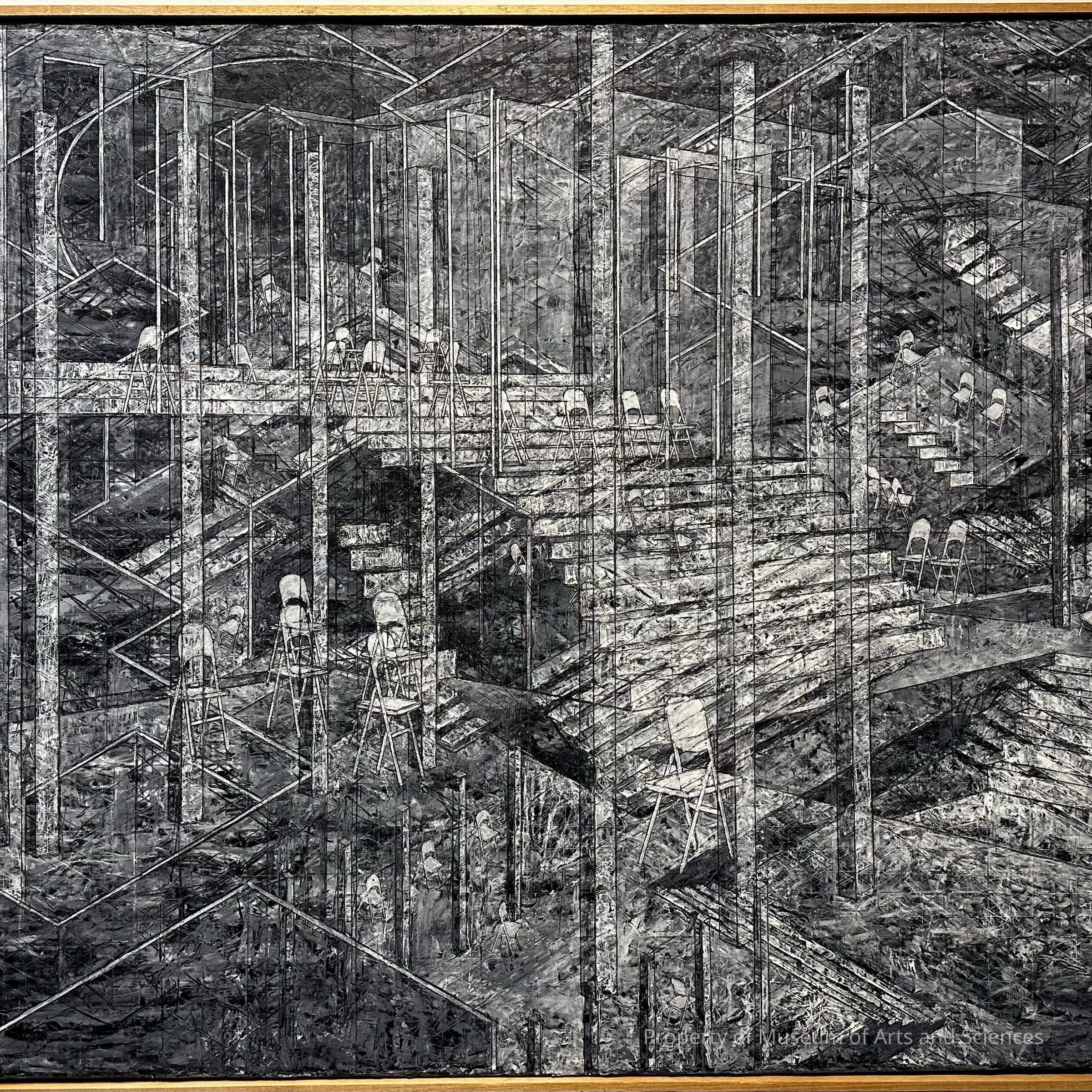 This painting is a calculated investigation which seeks comprehension in dreamlike and obscure landscapes of interior and exterior space. The enchantment of the work is found in its encaustic execution. The result is a bond of architectural precision and artistic spontaneity.