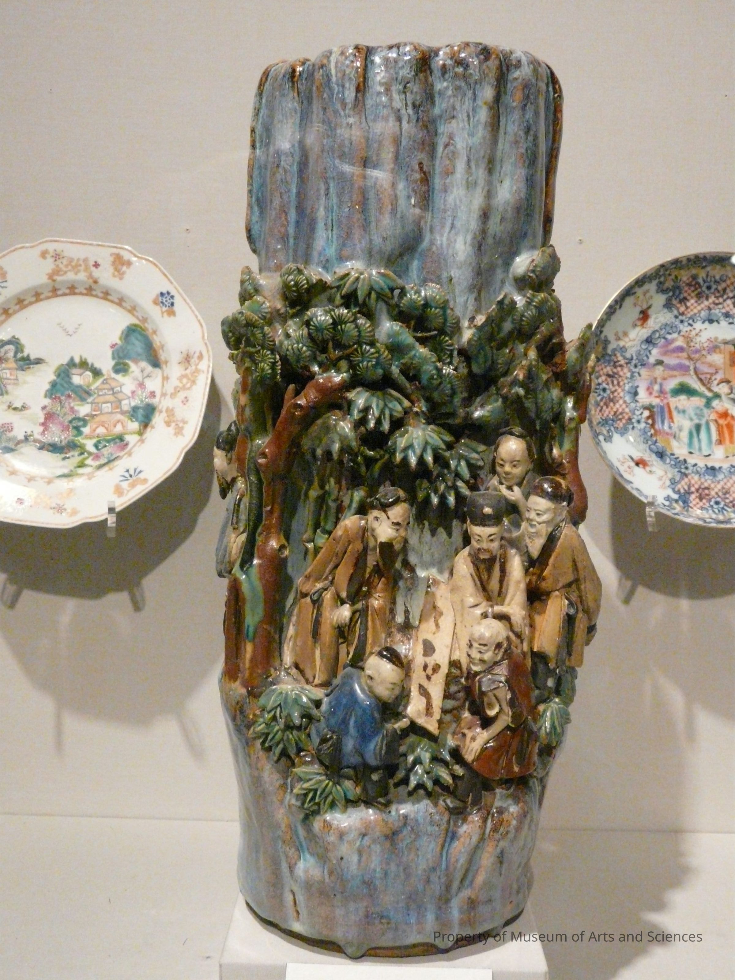 Chinese scholar's vase has an oblong lozenge shape with aplied slip mandarin vollage scene set in a pine forest. The vase is fully decorated with village scenes girdlin it in a muted polychrom coloring. Flambe glaze covers the entire background. 19.5"h.Artwork Details