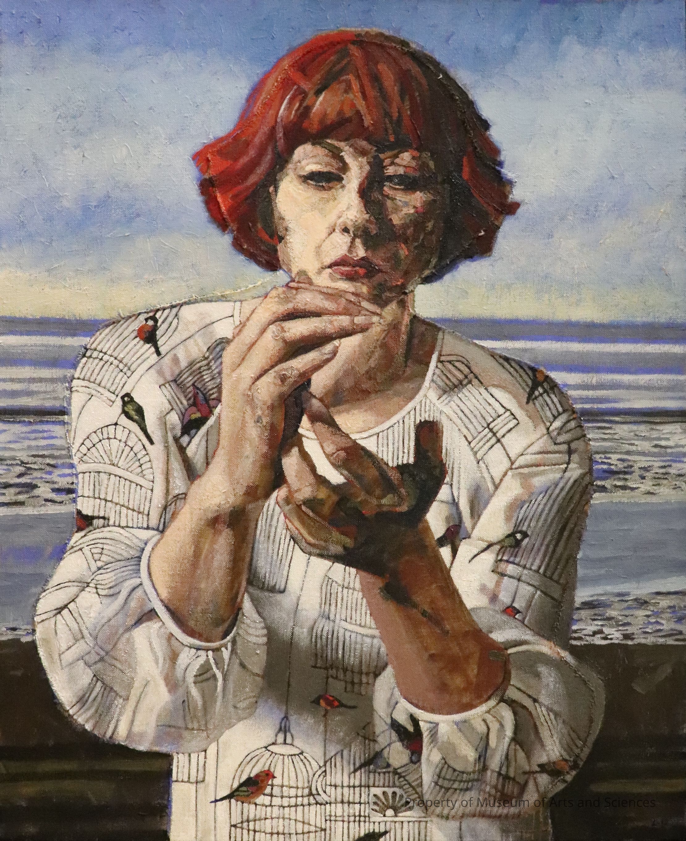 Female portrait with bird and birdcage printed blouse. Empty hands held outward toward viewer.Artwork Details