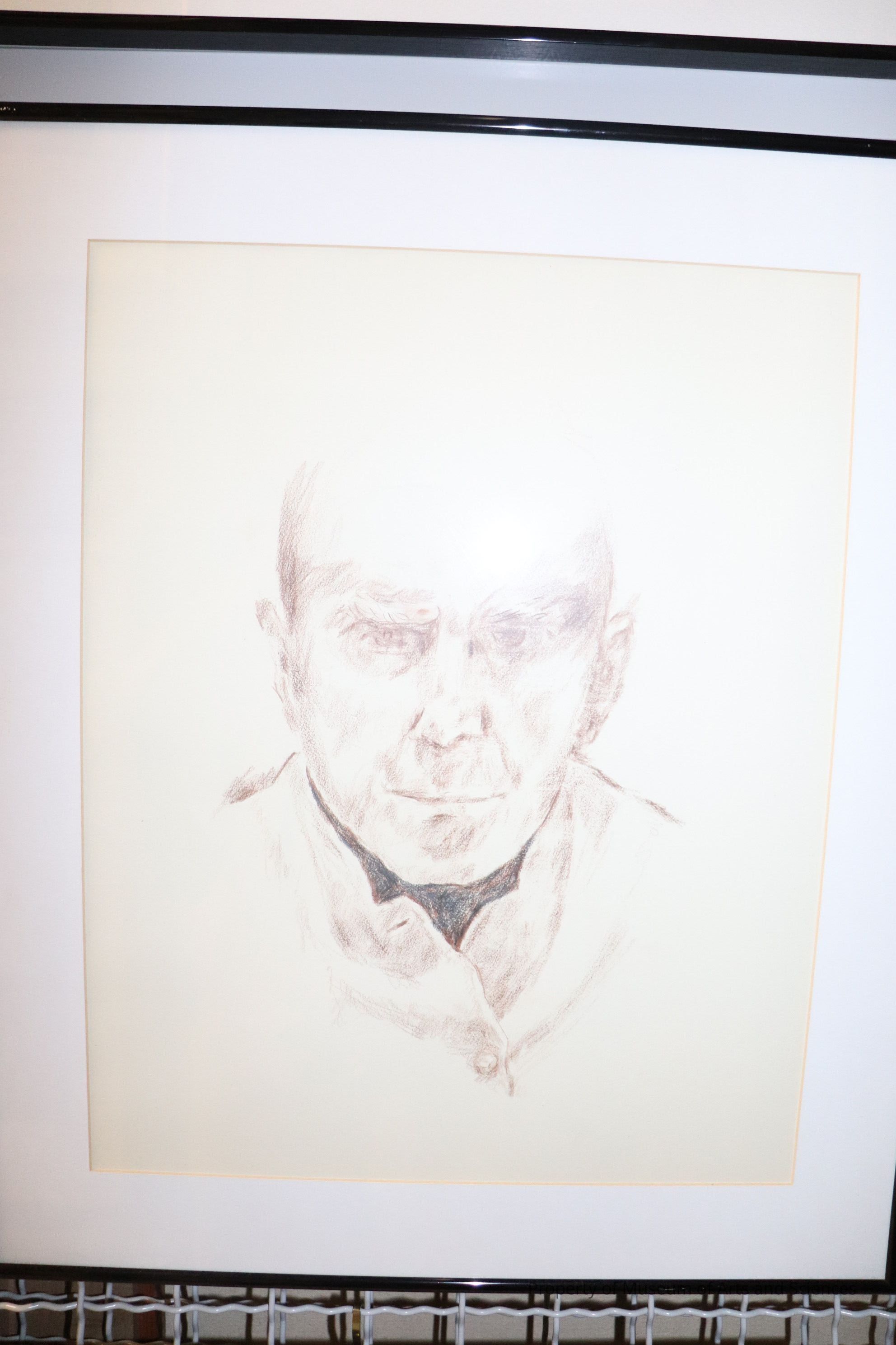 Self Portrait done towards the end of his series, frontal view of his face without his eye petch that he wore due to the loss of his eye from a car crash in 1970. This self portrait is rendered in conte crayon on cream wove paper and framed behin class.Collection
