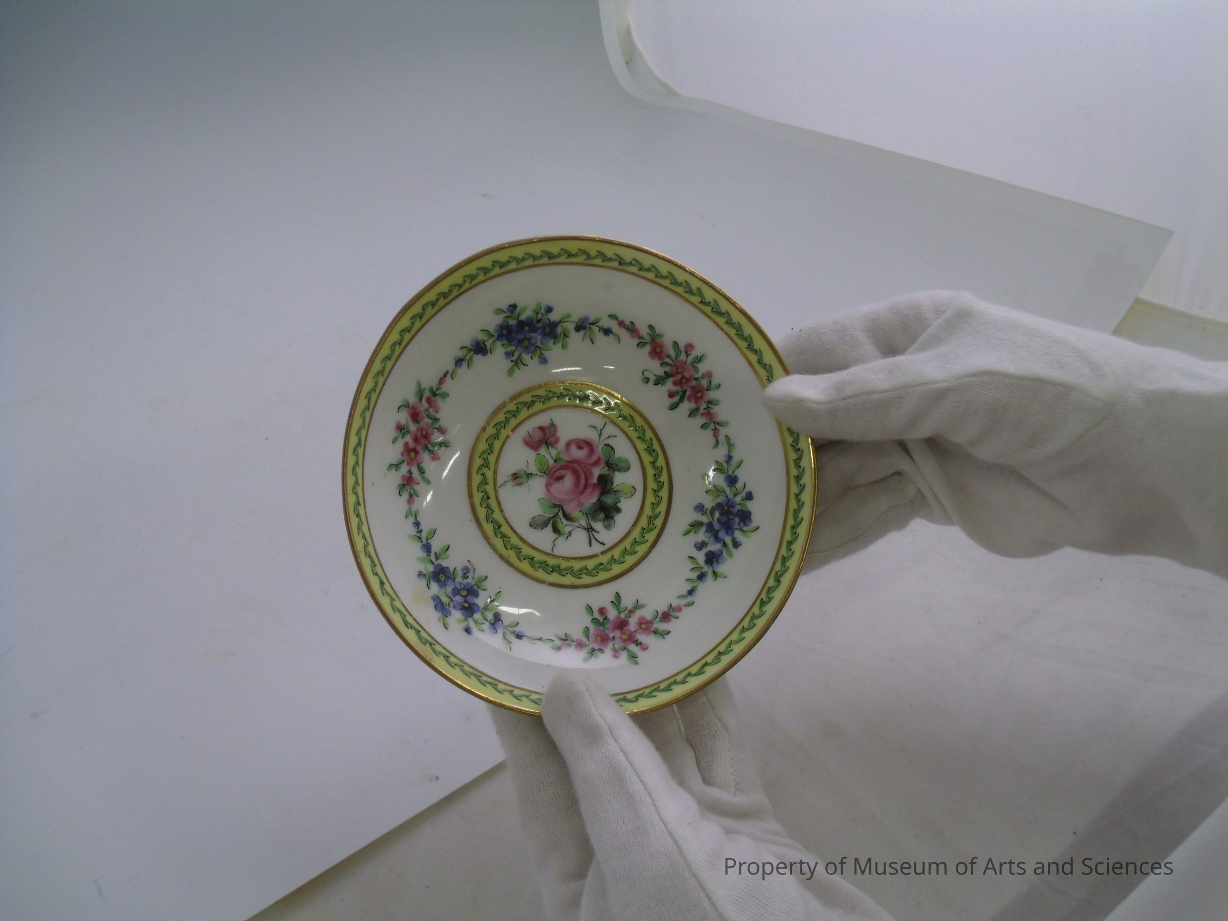 a Sevres porcelain cup and saucer, RF mark, yellow with floral banding, gilt trimCollection