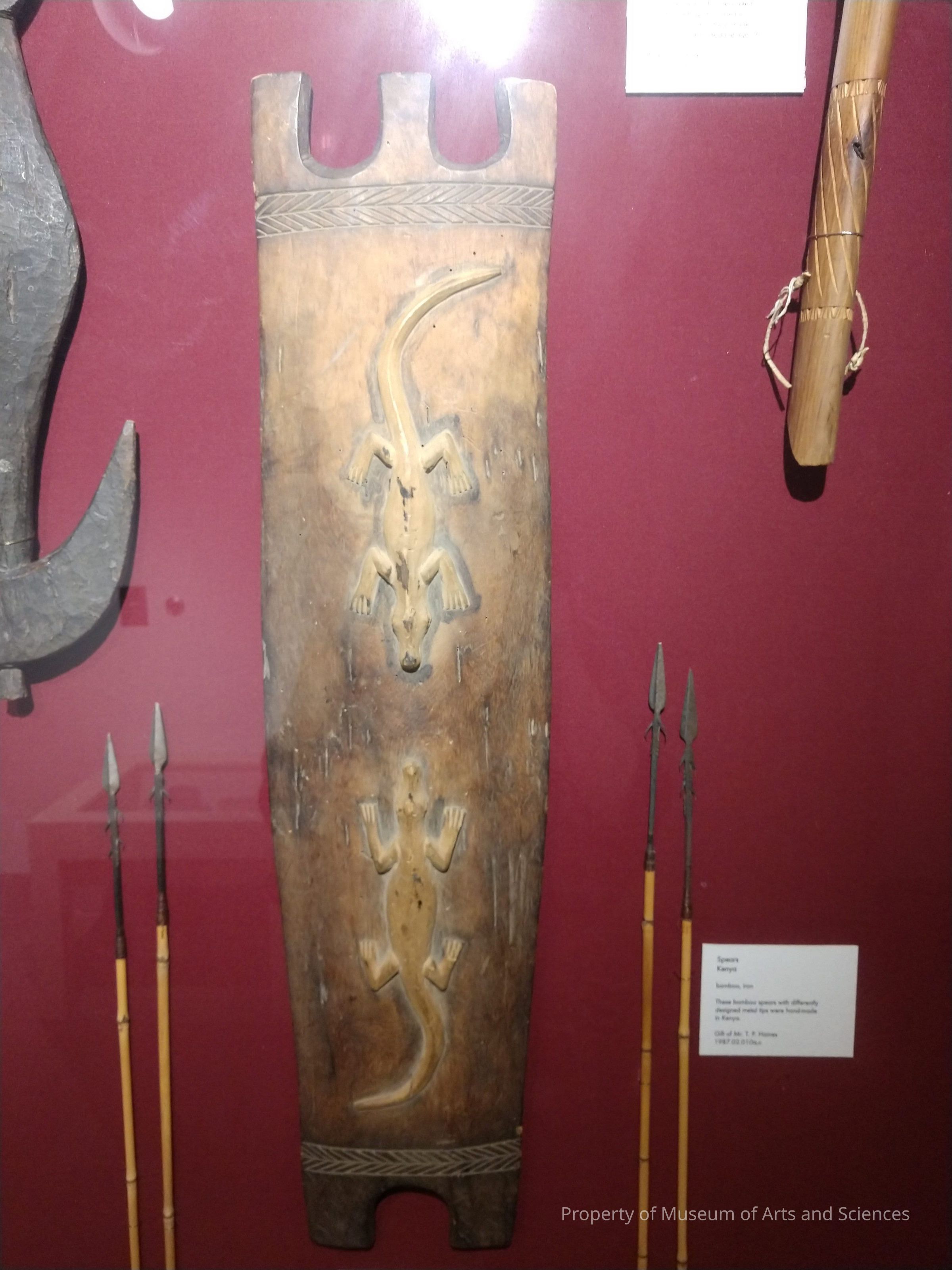 Wooden long and narrow, greatest thickness in middle, 2 ghinko lizards facing each other carved from same piece of wood but not stained dark brown, 2 prongs at one end and 3 prongs at other, design carved as border at each end, small handle carved in theCollection