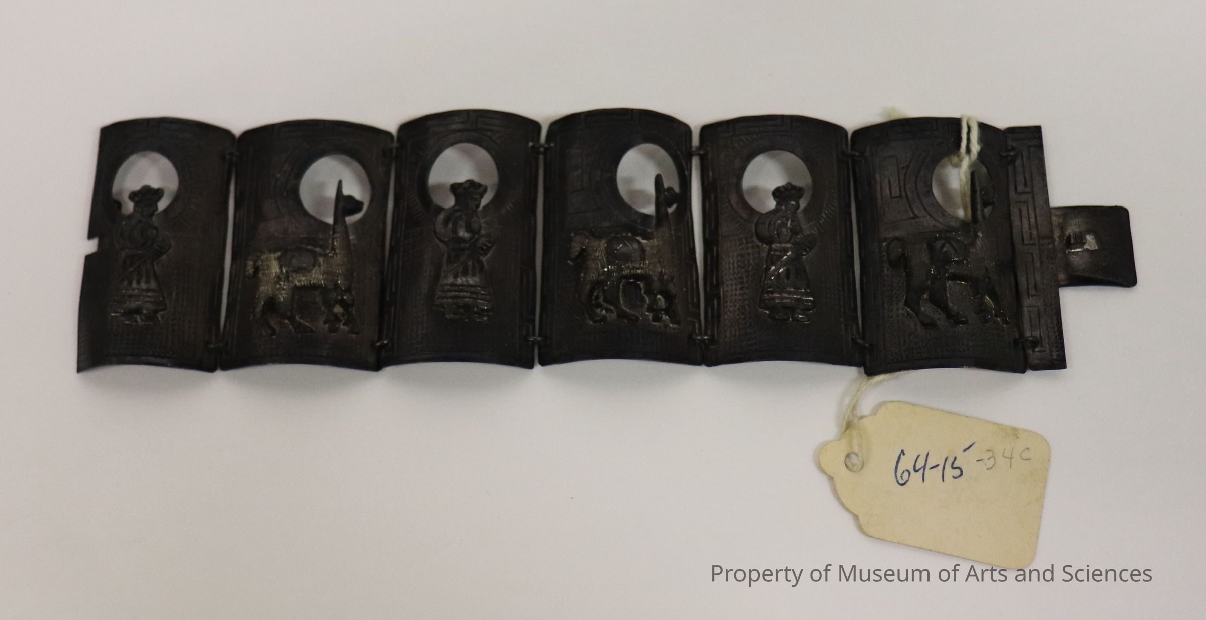 This is "c". "a" and "b" not located. Heavily tarnished silver bracelet. 6 curved, rectangular and connected pieces. Llama and male figure decoration.Collection