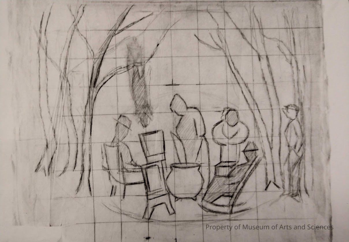 Group of men sitting and standing around large pot with long hog guttedArtwork Details