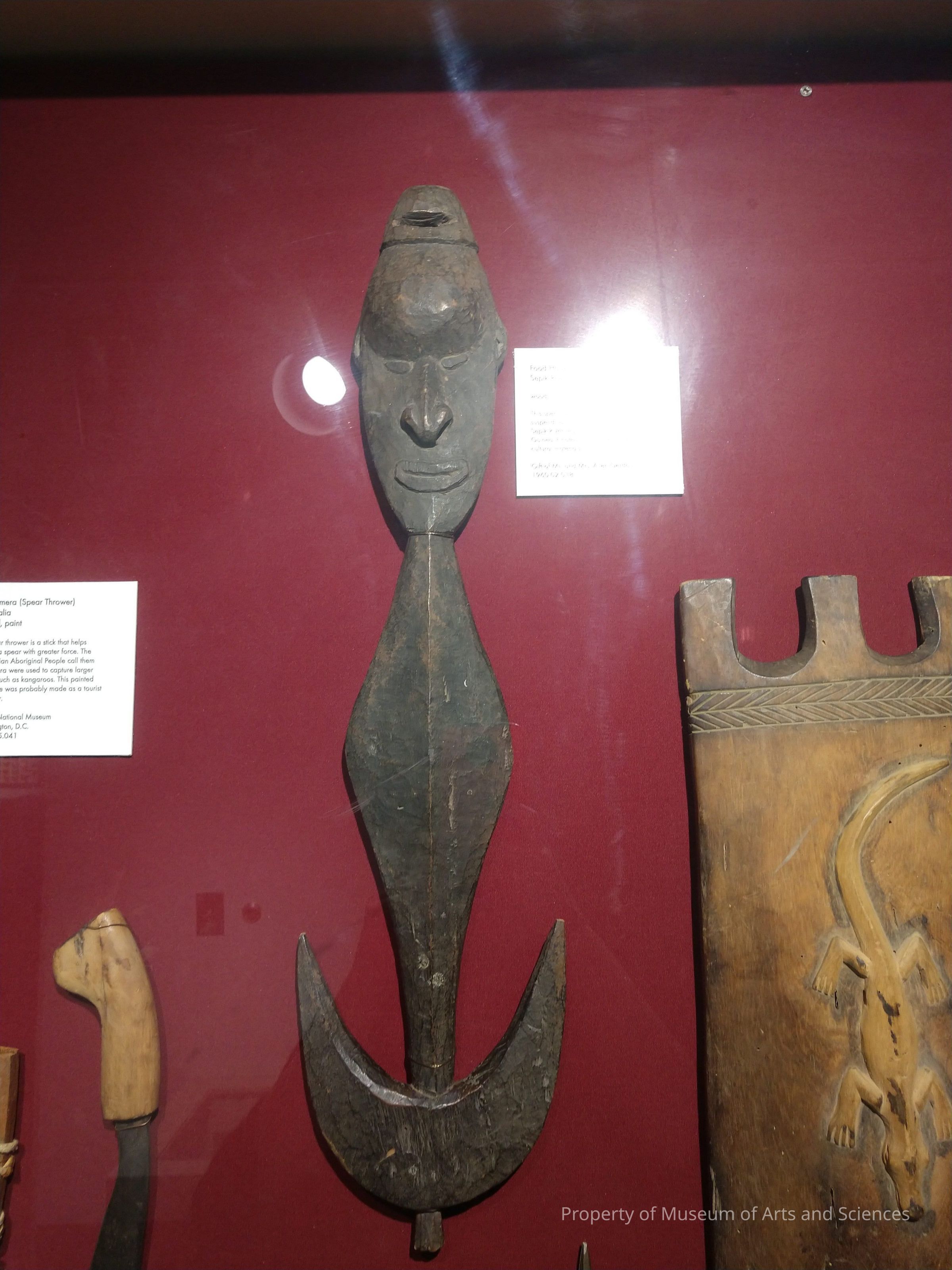 Hook for hanging ancestral skulls with moon shaped form underneath from which skulls were suspended.