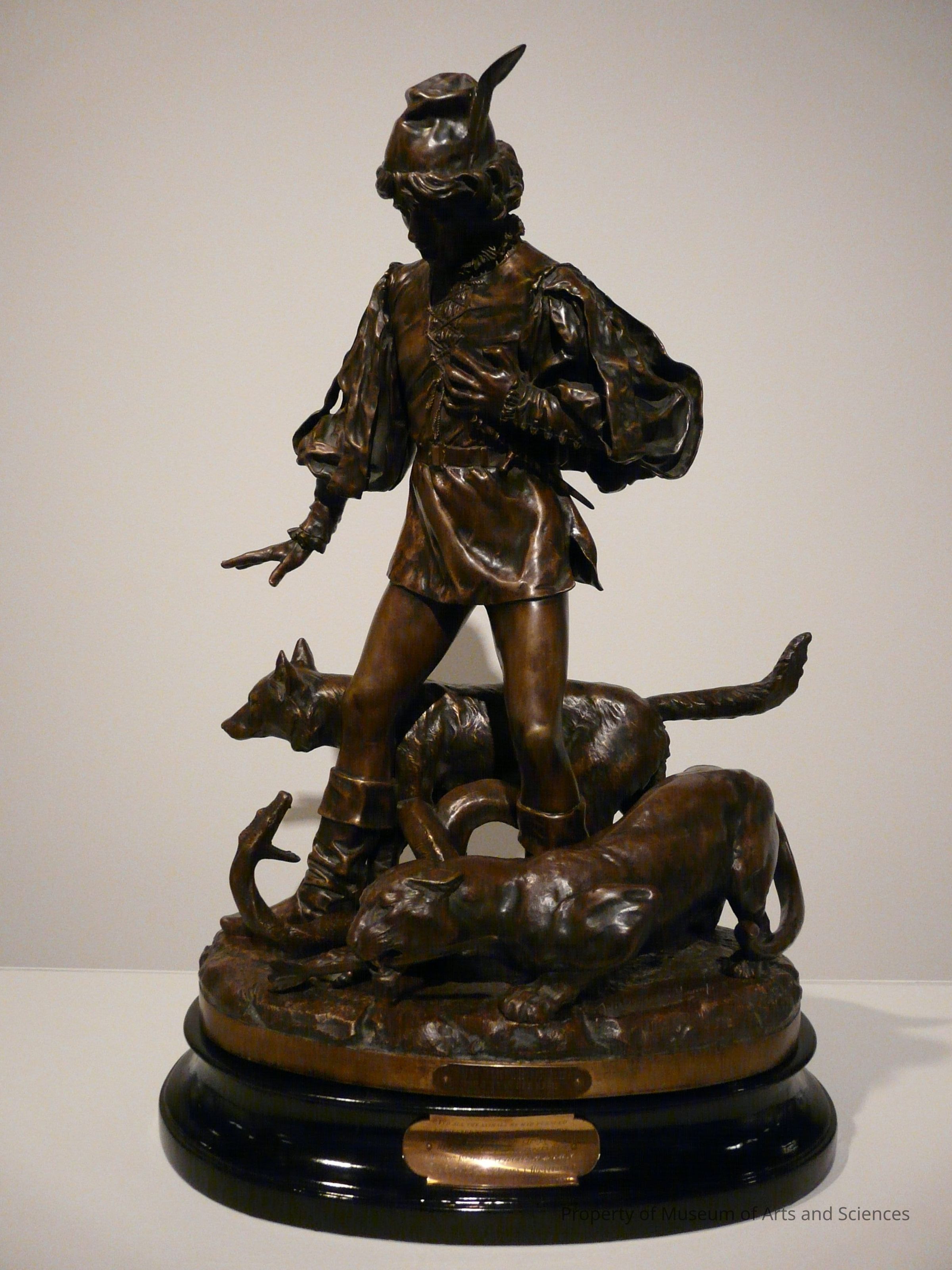 Sculpture of the young and terrified hunter in Renaissance costume is surrounded by his previous quarries: a lion with an arrow in its mouth; a snake coiled to satrike at the hunter's feet; and a dog/wolf on the right side.Collection