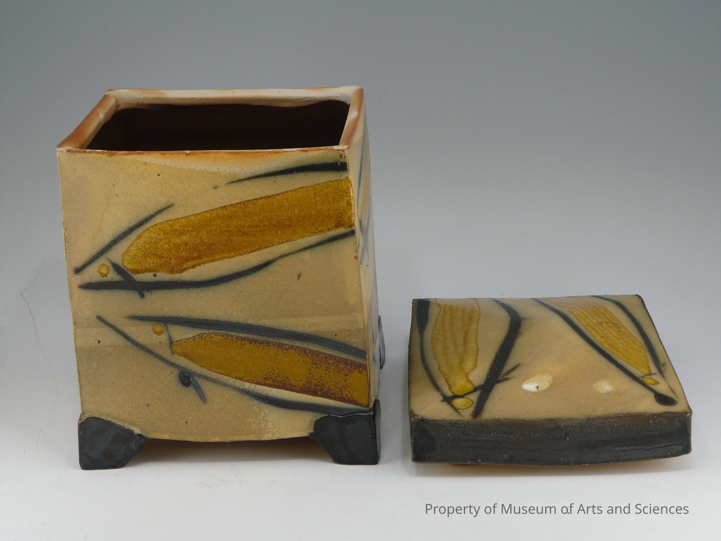 initials M.S.; square polyuchrome vessel with lid. Thrown and altered wood-fired stonewareCollection