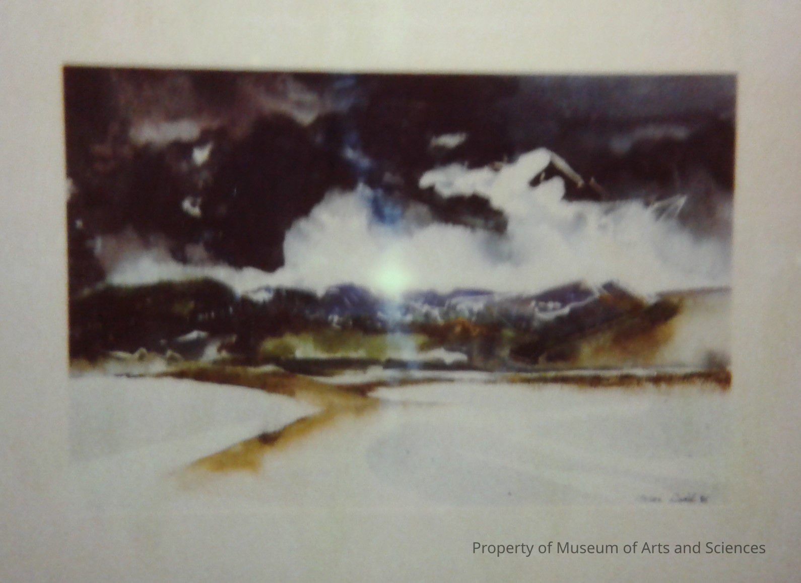 Transparent watercolor with areas of white paper showing through to give contrast and luminosity. The painting depicts a coastal land and water area, dark clouds loom above.Artwork Details
