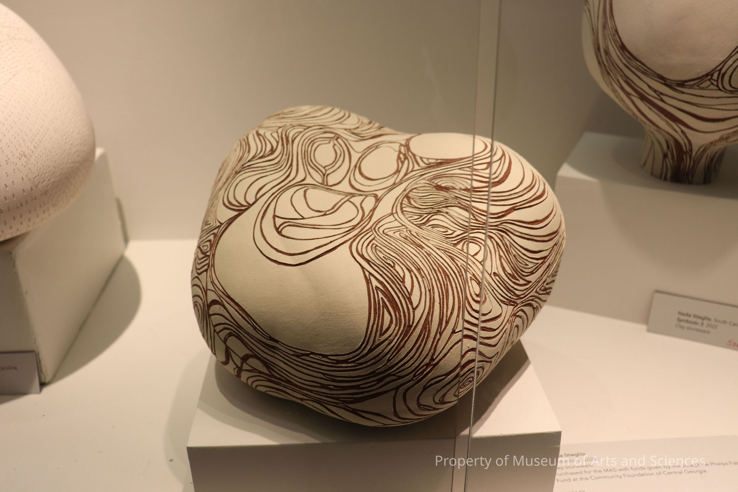 Off-white, bulbous, hollow form w/ etched, rust-colored, string-like design