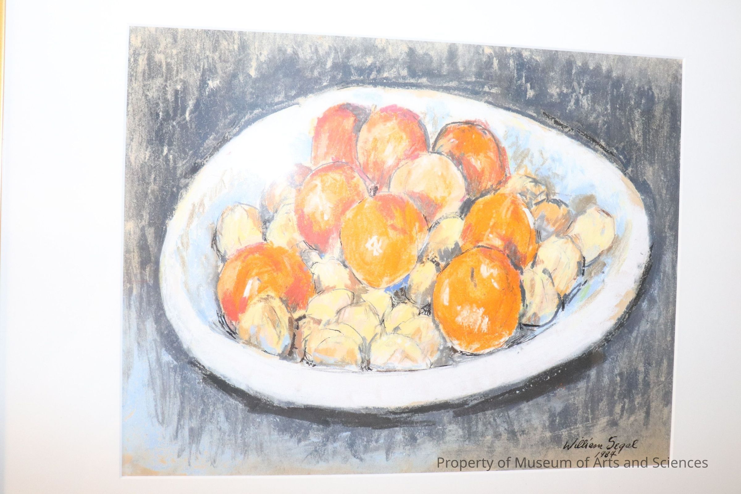 Pastel still life of tangerines in white ceramic bowl showing Cezanne like outline of fruit not particularly focused on the exact depiction of the illusion or perspective but more of looking and noting color, general relationships between objects, the line between object and space. marks are loose and confident.Collection