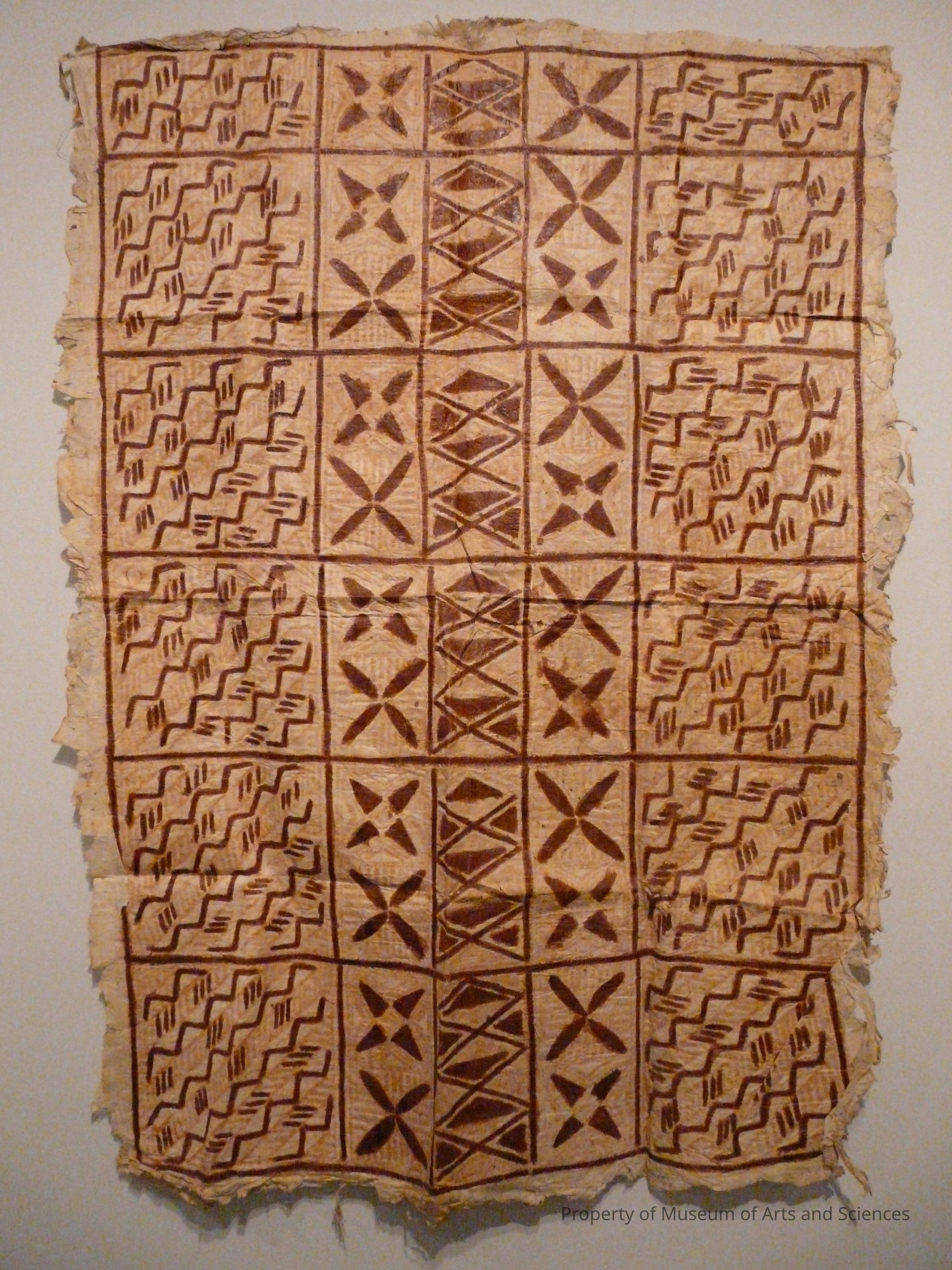 Individual perimeter blocks are 13" x 12" with medium brown wavy and slash patterns on a lighter brown pattern; central blocks 6" x 12" of X's and triangles in medium brown on a lighter brown geometric pattern, and flanked by blocks 6/5" x 12"Collection