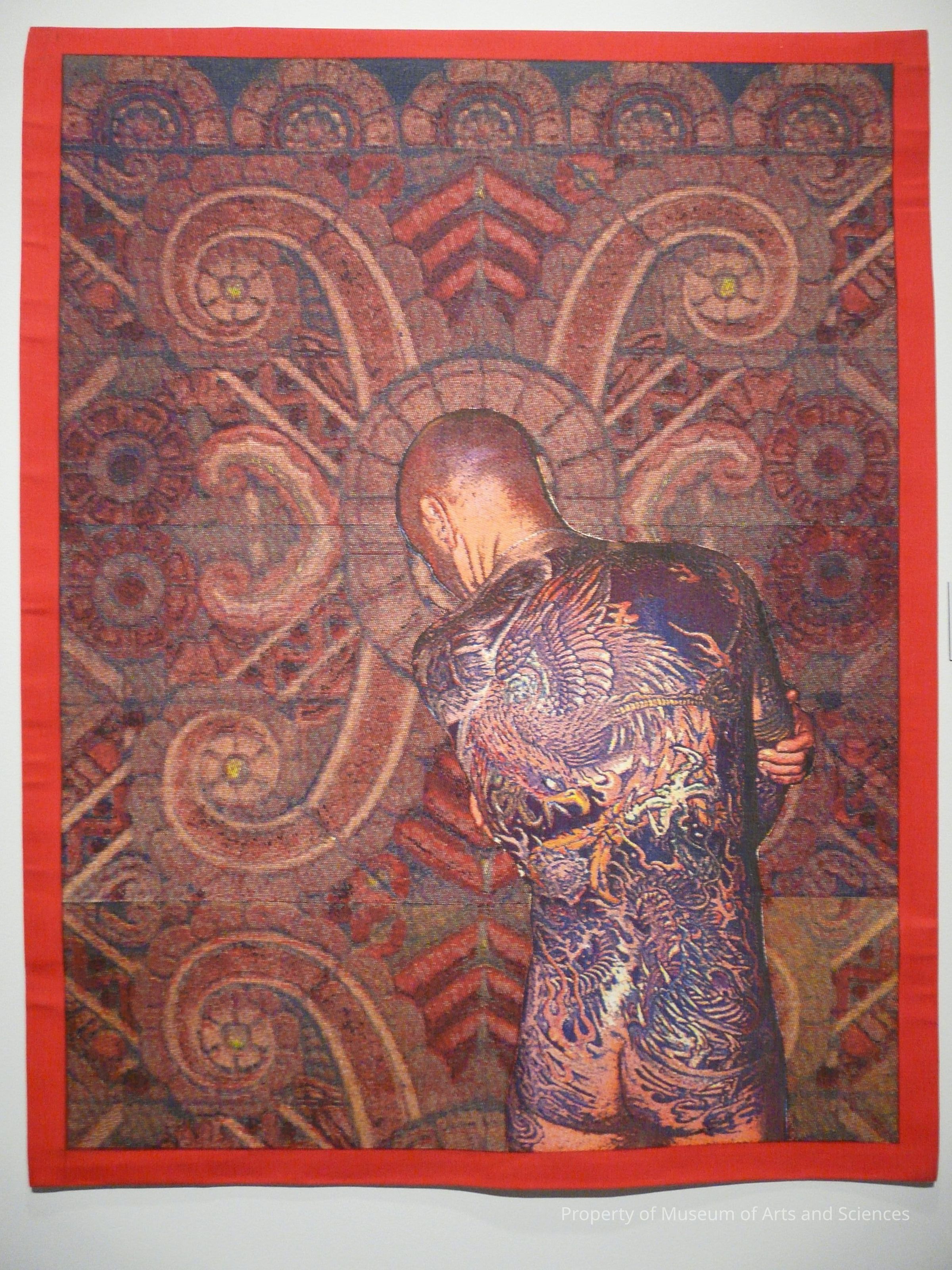 The screenprint shows a polychrome tapestry background in reds, black, yellows, purples and more. In the right forefront is the tattooed body of a bald male showing head, back, buttocks and upper thighs.Collection