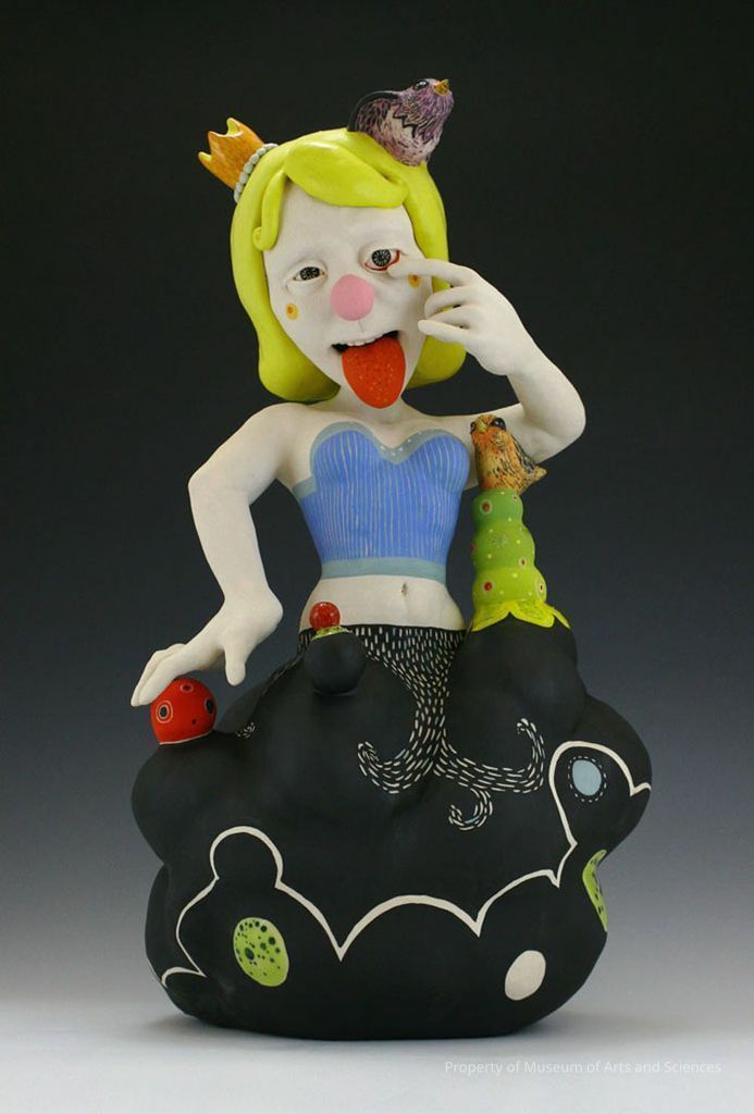 Figure looks female with one hand on side and other holding one eye open while sticking it's tounge out. The object itself is titled "Teasing"and is made of porcelain.Collection