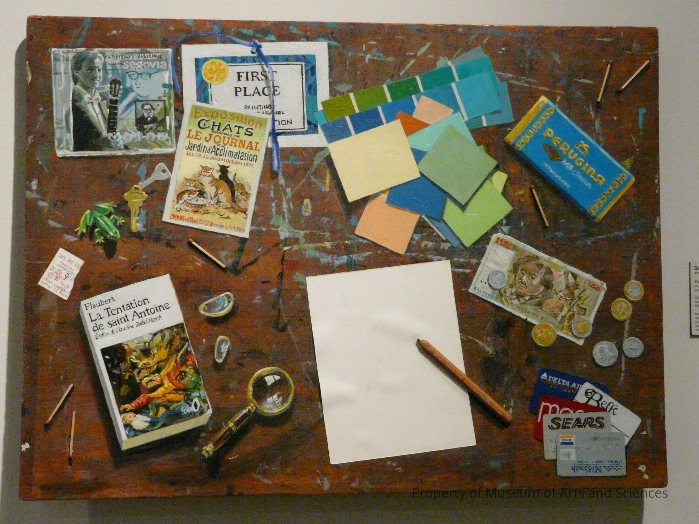 trompe l'oeil painting of the artist's worktop with cd cover, two books, award certificate, magnifying glass, chocolate bar wrapper, keys, credit cards. Painted on an aged wood drawing board with applied materialsArtwork Details